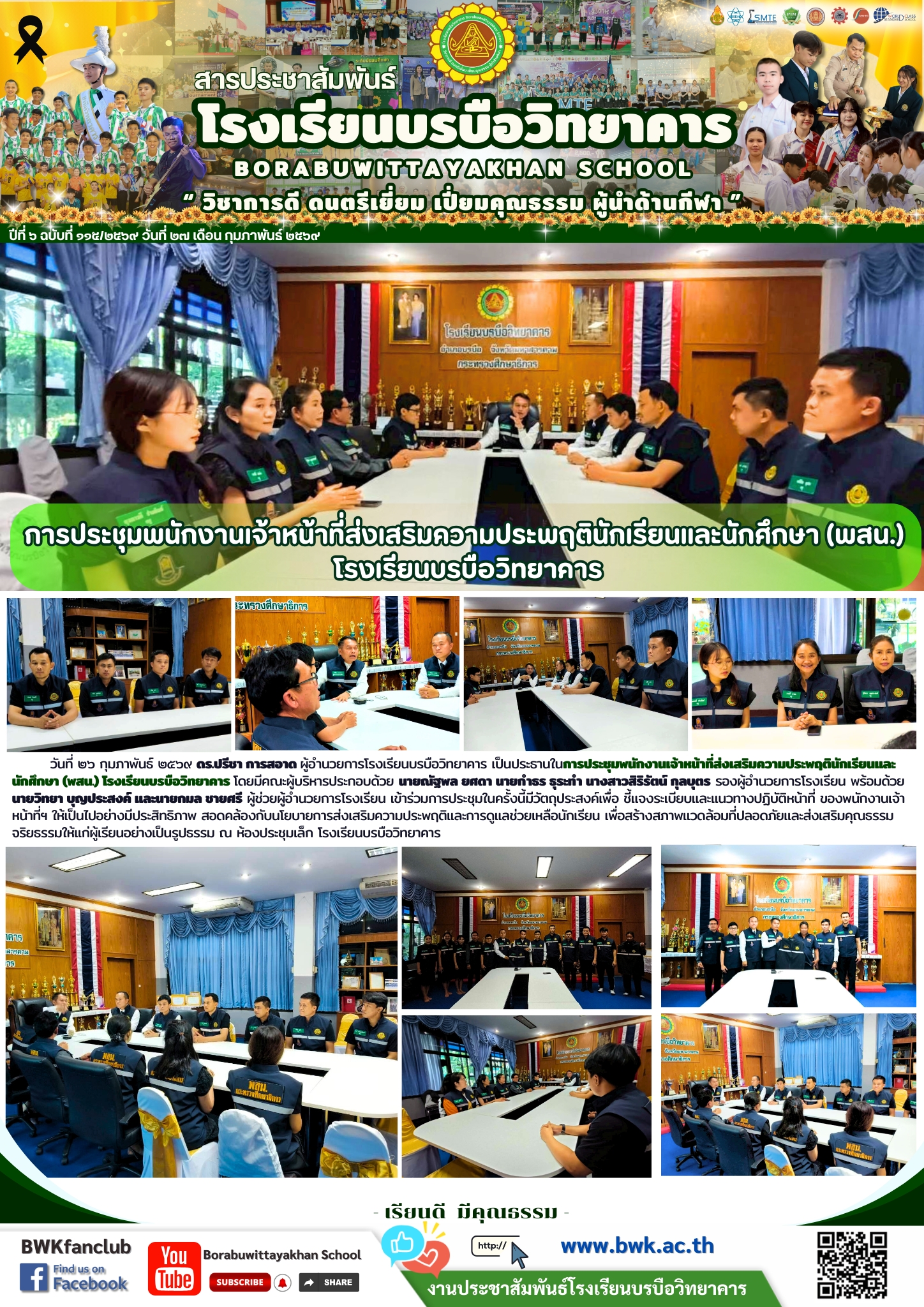 วันที่ ๒๖ กุมภาพันธ์ ๒๕๖๙ ดร.ปรีชา การสอาด ผู้อำนวยการโรงเรียนบรบือวิทยาคาร เป็นประธานในการประชุมพนักงานเจ้าหน้าที่ส่งเสริมความประพฤตินักเรียนและนักศึกษา (พสน.) โรงเรียนบรบือวิทยาคาร โดยมีคณะผู้บริหารประกอบด้วย นายณัฐพล ยศดา นายกำธร ธุระทำ นางสาวสิริรัตน์ กุลบุตร รองผู้อำนวยการโรงเรียน พร้อมด้วย นายวิทยา บุญประสงค์ และนายกมล ชายศรี ผู้ช่วยผู้อำนวยการโรงเรียน เข้าร่วมการประชุมในครั้งนี้มีวัตถุประสงค์เพื่อ ชี้แจงระเบียบและแนวทางปฏิบัติหน้าที่ ของพนักงานเจ้าหน้าที่ฯ ให้เป็นไปอย่างมีประสิทธิภาพ สอดคล้องกับนโยบายการส่งเสริมความประพฤติและการดูแลช่วยเหลือนักเรียน เพื่อสร้างสภาพแวดล้อมที่ปลอดภัยและส่งเสริมคุณธรรมจริยธรรมให้แก่ผู้เรียนอย่างเป็นรูปธรรม ณ ห้องประชุมเล็ก โรงเรียนบรบือวิทยาคาร