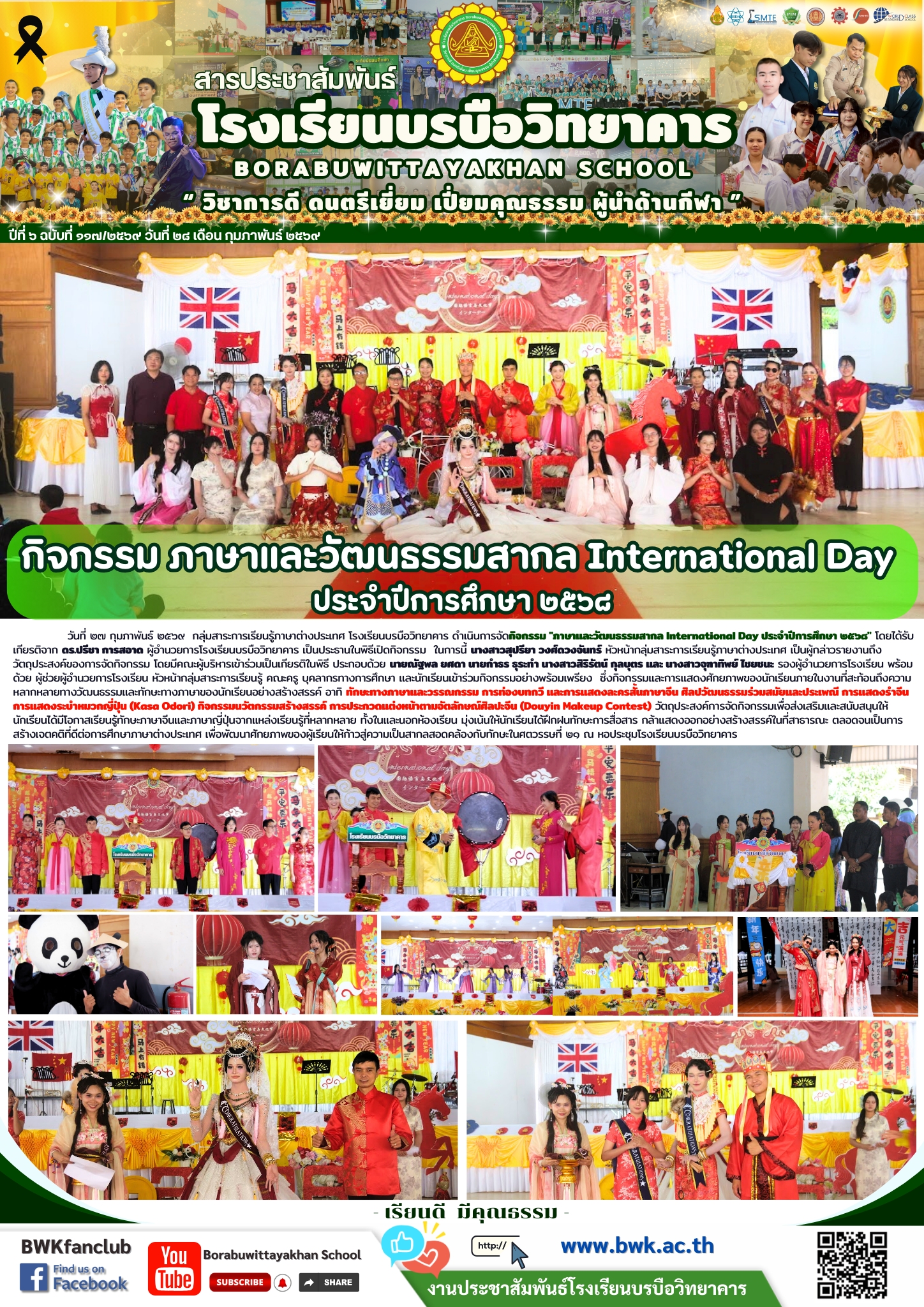 วันที่ ๒๗ กุมภาพันธ์ ๒๕๖๙ กลุ่มสาระการเรียนรู้ภาษาต่างประเทศ โรงเรียนบรบือวิทยาคาร ดำเนินการจัดกิจกรรม "ภาษาและวัฒนธรรมสากล International Day ประจำปีการศึกษา ๒๕๖๘" โดยได้รับเกียรติจาก ดร.ปรีชา การสอาด ผู้อำนวยการโรงเรียนบรบือวิทยาคาร เป็นประธานในพิธีเปิดกิจกรรม ในการนี้ นางสาวสุปรียา วงศ์ดวงจันทร์ หัวหน้ากลุ่มสาระการเรียนรู้ภาษาต่างประเทศ เป็นผู้กล่าวรายงานถึงวัตถุประสงค์ของการจัดกิจกรรม โดยมีคณะผู้บริหารเข้าร่วมเป็นเกียรติในพิธี ประกอบด้วย นายณัฐพล ยศดา นายกำธร ธุระทำ นางสาวสิริรัตน์ กุลบุตร และ นางสาวจุฑาทิพย์ ไชยชนะ รองผู้อำนวยการโรงเรียน พร้อมด้วย ผู้ช่วยผู้อำนวยการโรงเรียน หัวหน้ากลุ่มสาระการเรียนรู้ คณะครู บุคลากรทางการศึกษา และนักเรียนเข้าร่วมกิจกรรมอย่างพร้อมเพรียง ซึ่งกิจกรรมและการแสดงศักยภาพของนักเรียนภายในงานที่สะท้อนถึงความหลากหลายทางวัฒนธรรมและทักษะทางภาษาของนักเรียนอย่างสร้างสรรค์ อาทิ ทักษะทางภาษาและวรรณกรรม การท่องบทกวี และการแสดงละครสั้นภาษาจีน ศิลปวัฒนธรรมร่วมสมัยและประเพณี การแสดงรำจีน การแสดงระบำหมวกญี่ปุ่น (Kasa Odori) กิจกรรมนวัตกรรมสร้างสรรค์ การประกวดแต่งหน้าตามอัตลักษณ์ศิลปะจีน (Douyin Makeup Contest) วัตถุประสงค์การจัดกิจกรรมเพื่อส่งเสริมและสนับสนุนให้นักเรียนได้มีโอกาสเรียนรู้ทักษะภาษาจีนและภาษาญี่ปุ่นจากแหล่งเรียนรู้ที่หลากหลาย ทั้งในและนอกห้องเรียน มุ่งเน้นให้นักเรียนได้ฝึกฝนทักษะการสื่อสาร กล้าแสดงออกอย่างสร้างสรรค์ในที่สาธารณะ ตลอดจนเป็นการสร้างเจตคติที่ดีต่อการศึกษาภาษาต่างประเทศ เพื่อพัฒนาศักยภาพของผู้เรียนให้ก้าวสู่ความเป็นสากลสอดคล้องกับทักษะในศตวรรษที่ ๒๑ ณ หอประชุมโรงเรียนบรบือวิทยาคาร