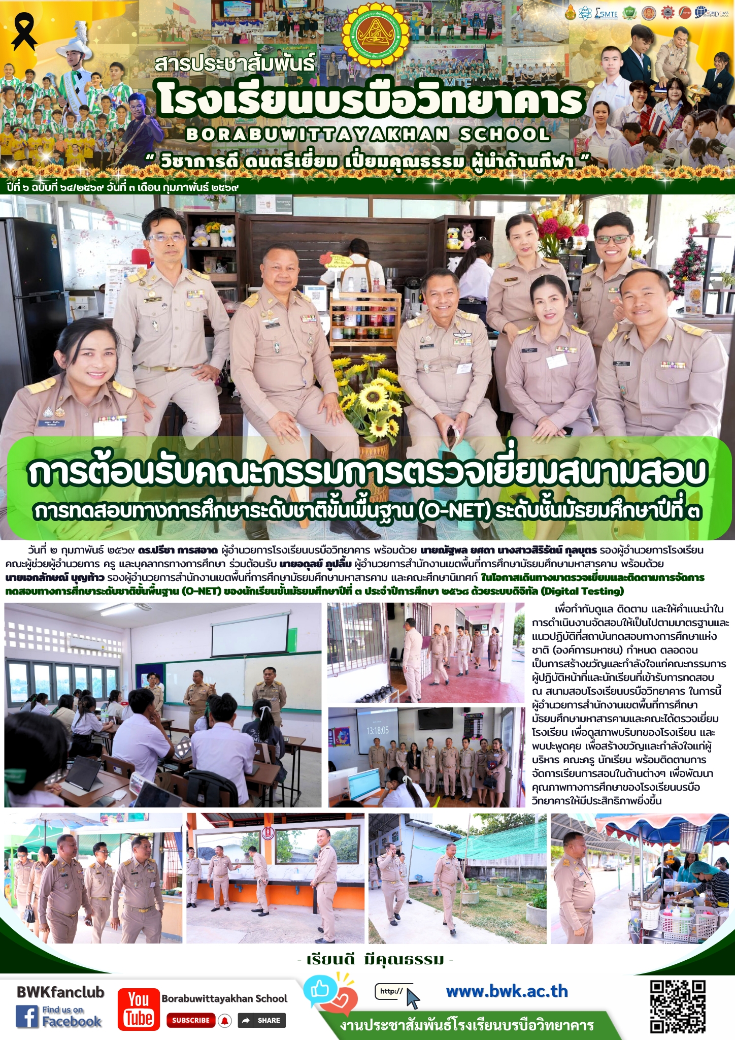 วันที่ ๒ กุมภาพันธ์ ๒๕๖๙ ดร.ปรีชา การสอาด ผู้อำนวยการโรงเรียนบรบือวิทยาคาร พร้อมด้วย นายณัฐพล ยศดา นางสาวสิริรัตน์ กุลบุตร รองผู้อำนวยการโรงเรียน คณะผู้ช่วยผู้อำนวยการ ครู และด้วยระบบดิจิทัล (Digital Testing) เพื่อกำกับดูแล ติดตาม และให้คำแนะนำในการดำเนินงานจัดสอบให้เป็นไปตามมาตรฐานและแนวปฏิบัติที่สถาบันทดสอบทางการศึกษาแห่งชาติ (องค์การมหาชน) กำหนด ตลอดจนเป็นการสร้างขวัญและกำลังใจแก่คณะกรรมการผู้ปฏิบัติหน้าที่และนักเรียนที่เข้ารับการทดสอบ ณ สนามสอบโรงเรียนบรบือวิทยาคาร ในการนี้ ผู้อำนวยการสำนักงานเขตพื้นที่การศึกษามัธยมศึกษามหาสารคามและคณะ ได้ตรวจเยี่ยมโรงเรียน เพื่อดูสภาพบริบทของโรงเรียน และพบปะพูดคุย เพื่อสร้างขวัญและกำลังใจแก่ผู้บริหาร คณะครู นักเรียน พร้อมติดตามการจัดการเรียนการสอนในด้านต่างๆ เพื่อพัฒนาคุณภาพทางการศึกษาของโรงเรียนบรบือวิทยาคารให้มีประสิทธิภาพยิ่งขึ้น