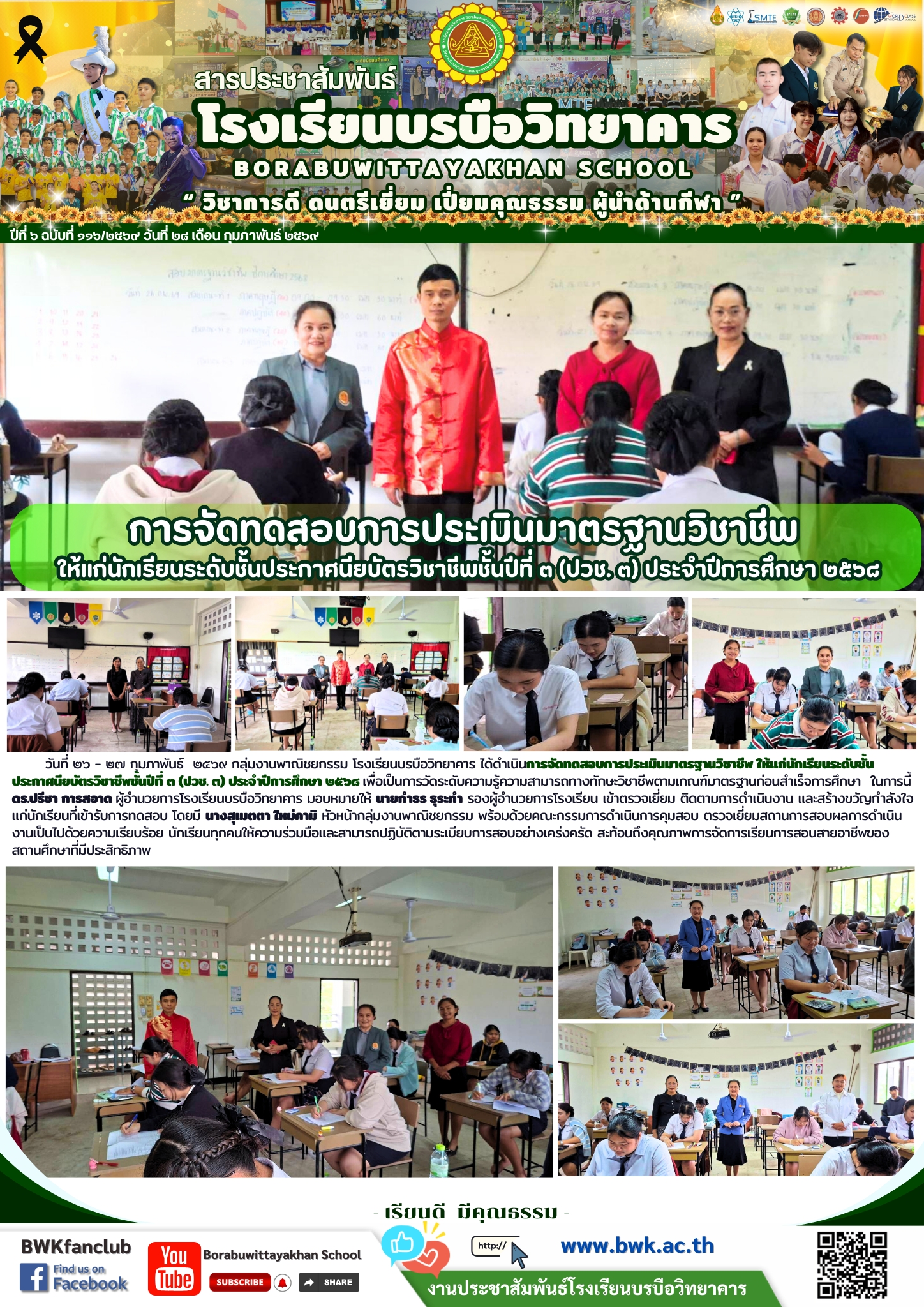 วันที่ ๒๖ - ๒๗ กุมภาพันธ์ ๒๕๖๙ กลุ่มงานพาณิชยกรรม โรงเรียนบรบือวิทยาคาร ได้ดำเนินการจัดทดสอบการประเมินมาตรฐานวิชาชีพ ให้แก่นักเรียนระดับชั้นประกาศนียบัตรวิชาชีพชั้นปีที่ ๓ (ปวช. ๓) ประจำปีการศึกษา ๒๕๖๘ เพื่อเป็นการวัดระดับความรู้ความสามารถทางทักษะวิชาชีพตามเกณฑ์มาตรฐานก่อนสำเร็จการศึกษา ในการนี้ ดร.ปรีชา การสอาด ผู้อำนวยการโรงเรียนบรบือวิทยาคาร มอบหมายให้ นายกำธร ธุระทำ รองผู้อำนวยการโรงเรียน เข้าตรวจเยี่ยม ติดตามการดำเนินงาน และสร้างขวัญกำลังใจแก่นักเรียนที่เข้ารับการทดสอบ โดยมี นางสุเมตตา ใหม่คามิ หัวหน้ากลุ่มงานพาณิชยกรรม พร้อมด้วยคณะกรรมการดำเนินการคุมสอบ ตรวจเยี่ยมสถานการสอบผลการดำเนินงานเป็นไปด้วยความเรียบร้อย นักเรียนทุกคนให้ความร่วมมือและสามารถปฏิบัติตามระเบียบการสอบอย่างเคร่งครัด สะท้อนถึงคุณภาพการจัดการเรียนการสอนสายอาชีพของสถานศึกษาที่มีประสิทธิภาพ