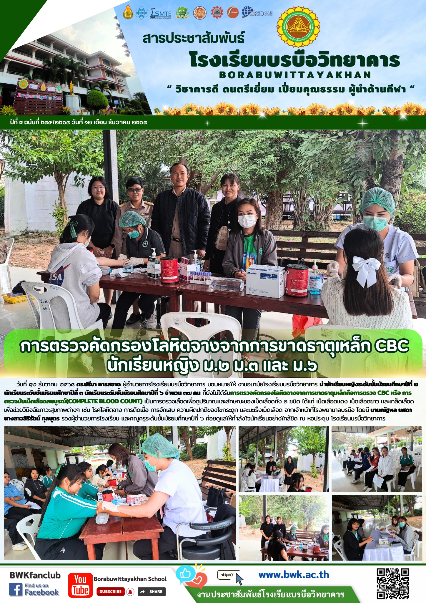 วันที่ ๑๒ ธันวาคม ๒๕๖๘ ดร.ปรีชา การสอาด ผู้อำนวยการโรงเรียนบรบือวิทยาคาร มอบหมายให้ งานอนามัยโรงเรียนบรบือวิทยาคาร นำนักเรียนหญิงระดับชั้นมัธยมศึกษาปีที่ ๒ นักเรียนระดับชั้นมัธยมศึกษาปีที่ ๓ นักเรียนระดับชั้นมัธยมศึกษาปีที่ ๖ จำนวน ๓๗ คน ที่ยังไม่ได้รับการตรวจคัดกรองโลหิตจางจากการขาดธาตุเหล็กคือการตรวจ CBC หรือ การตรวจนับเม็ดเลือดสมบูรณ์(Complete Blood Count) เป็นการตรวจเลือดเพื่อดูปริมาณและลักษณะของเม็ดเลือดทั้ง ๓ ชนิด ได้แก่ เม็ดเลือดแดง เม็ดเลือดขาว และเกล็ดเลือด เพื่อช่วยวินิจฉัยภาวะสุขภาพต่างๆ เช่น โรคโลหิตจาง การติดเชื้อ การอักเสบ ความผิดปกติของไขกระดูก และมะเร็งเม็ดเลือด จากเจ้าหน้าที่โรงพยาบาลบรบือ โดยมี นายณัฐพล ยศดา นางสาวสิริรัตน์ กุลบุตร รองผู้อำนวยการโรงเรียน และคณูครูระดับชั้นมัธยมศึกษาปีที่ ๖ ค่อยดูแลให้กำลังใจนักเรียนอย่างใกล้ชิด ณ หอประชุม โรงเรียนบรบือวิทยาคาร