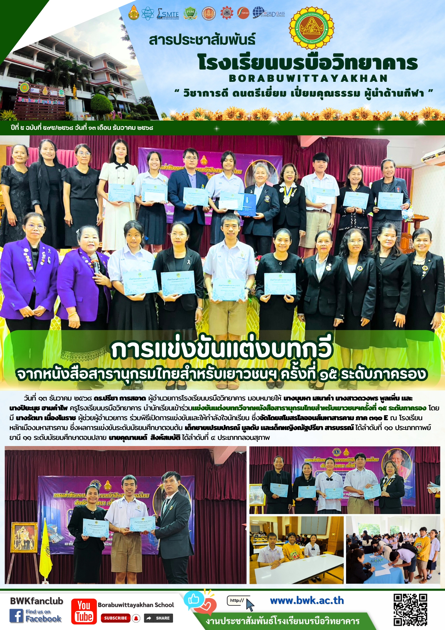 วันที่ ๑๓ ธันวาคม ๒๕๖๘ ดร.ปรีชา การสอาด ผู้อำนวยการโรงเรียนบรบือวิทยาคาร มอบหมายให้ นางบุบผา เสนาคำ นางสาวดวงพร พูลเพิ่ม และ นางปิยะนุช ฮามคำไพ ครูโรงเรียนบรบือวิทยาคาร นำนักเรียนเข้าร่วมแข่งขันแต่งบทกวีจากหนังสือสารานุกรมไทยสำหรับเยาวชนฯครั้งที่ ๑๕ ระดับภาครอง โดยมี นางรัตนา เนื่องโนราช ผู้ช่วยผู้อำนวยการ ร่วมพิธีเปิดการแข่งขันและให้กำลังใจนักเรียน ซึ่งจัดโดยสโมสรไลออนส์มหาสารคาม ภาค ๓๑๐ E ณ โรงเรียนหลักเมืองมหาสารคาม ซึ่งผลการแข่งขันระดับมัธยมศึกษาตอนต้น เด็กชายเปรมปกรณ์ มูลดับ และเด็กหญิงณัฐปรียา สารบรรณ์ ได้ลำดับที่ ๑๐ ประเภทกาพย์ยานี ๑๑ ระดับมัธยมศึกษาตอนปลาย นายคุณานนต์ สิงห์สมบัติ ได้ลำดับที่ ๔ ประเภทกลอนสุภาพ