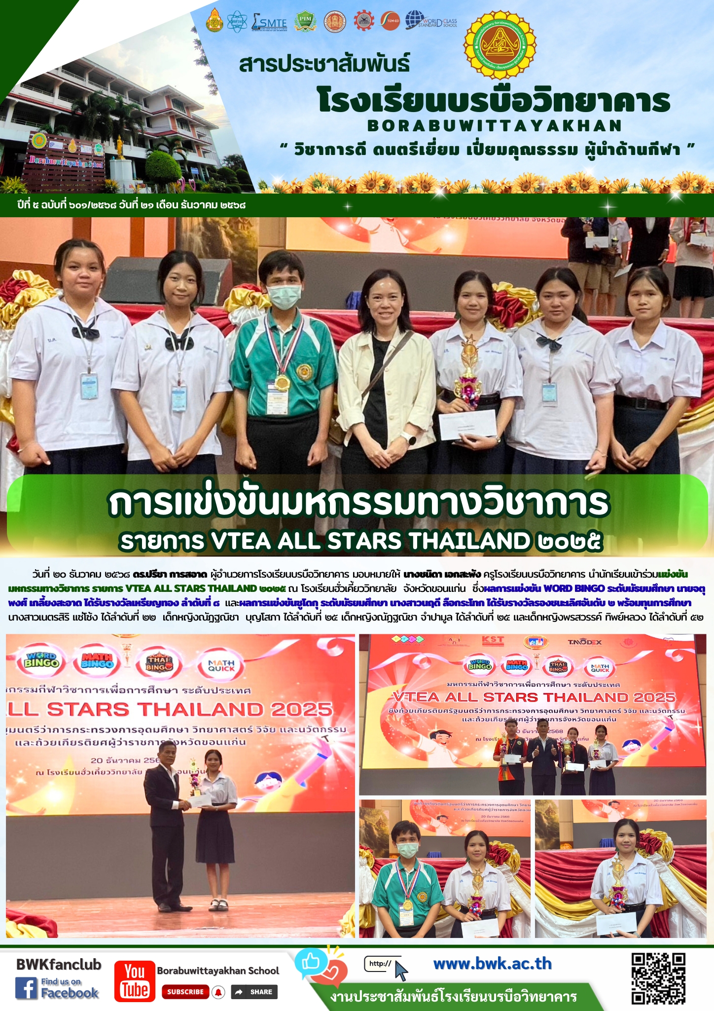 วันที่ ๒๐ ธันวาคม ๒๕๖๘ ดร.ปรีชา การสอาด ผู้อำนวยการโรงเรียนบรบือวิทยาคาร มอบหมายให้ นางชนิดา เอกสะพัง ครูโรงเรียนบรบือวิทยาคาร นำนักเรียนเข้าร่วมแข่งขันมหกรรมทางวิชาการ รายการ VTEA ALL STARS THAILAND ๒๐๒๕ ณ โรงเรียนฮั่วเคี้ยววิทยาลัย จังหวัดขอนแก่น ซึ่งผลการแข่งขัน Word Bingo ระดับมัธยมศึกษา นายจตุพงศ์ เกลี้ยงสะอาด ได้รับรางวัลเหรียญทอง ลำดับที่ ๘ และผลการแข่งขันซูโดกุ ระดับมัธยมศึกษา นางสาวนฤดี ลือกระโทก ได้รับรางวัลรองชนะเลิศอันดับ ๒ พร้อมทุนการศึกษา นางสาวเนตรสิริ เเซ่โซ้ง ได้ลำดับที่ ๒๒ เด็กหญิงณัฏฐณิชา บุญโสภา ได้ลำดับที่ ๒๕ เด็กหญิงณัฏฐณิชา จำปามูล ได้ลำดับที่ ๒๕ และเด็กหญิงพรสวรรค์ ทิพย์หลวง ได้ลำดับที่ ๕๒