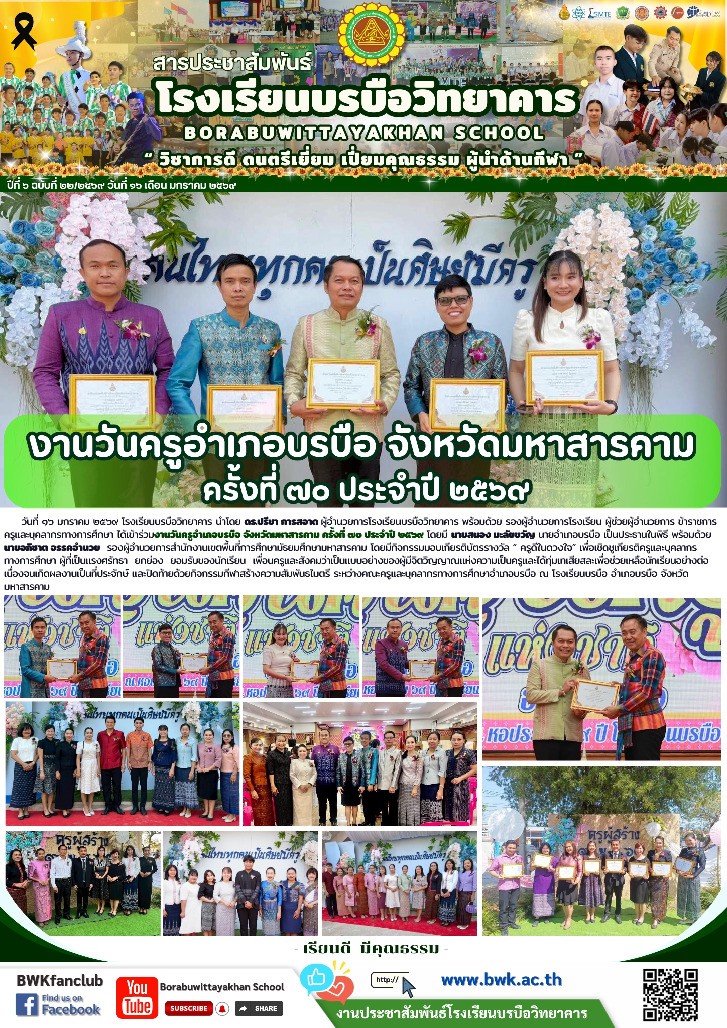 วันที่ ๑๖ มกราคม ๒๕๖๙ โรงเรียนบรบือวิทยาคาร นำโดย ดร.ปรีชา การสอาด ผู้อำนวยการโรงเรียนบรบือวิทยาคาร พร้อมด้วย รองผู้อำนวยการโรงเรียน ผู้ช่วยผู้อำนวยการ ข้าราชการครูและบุคลากรทางการศึกษา ได้เข้าร่วมงานวันครูอำเภอบรบือ จังหวัดมหาสารคาม ครั้งที่ ๗๐ ประจำปี ๒๕๖๙ โดยมี นายสนอง มะลัยขวัญ นายอำเภอบรบือ เป็นประธานในพิธี พร้อมด้วย นายอภิชาต อรรคอำนวย รองผู้อำนวยการสำนักงานเขตพื้นที่การศึกษามัธยมศึกษามหาสารคาม โดยมีกิจกรรมมอบเกียรติบัตรรางวัล “ ครูดีในดวงใจ” เพื่อเชิดชูเกียรติครูและบุคลากรทางการศึกษา ผู้ที่เป็นแรงศรัทธา ยกย่อง ยอมรับของนักเรียน เพื่อนครูและสังคมว่าเป็นแบบอย่างของผู้มีจิตวิญญาณแห่งความเป็นครูและได้ทุ่มเทเสียสละเพื่อช่วยเหลือนักเรียนอย่างต่อเนื่องจนเกิดผลงานเป็นที่ประจักษ์ และปิดท้ายด้วยกิจกรรมกีฬาสร้างความสัมพันธไมตรี ระหว่างคณะครูและบุคลากรทางการศึกษาอำเภอบรบือ ณ โรงเรียนบรบือ อำเภอบรบือ จังหวัดมหาสารคาม