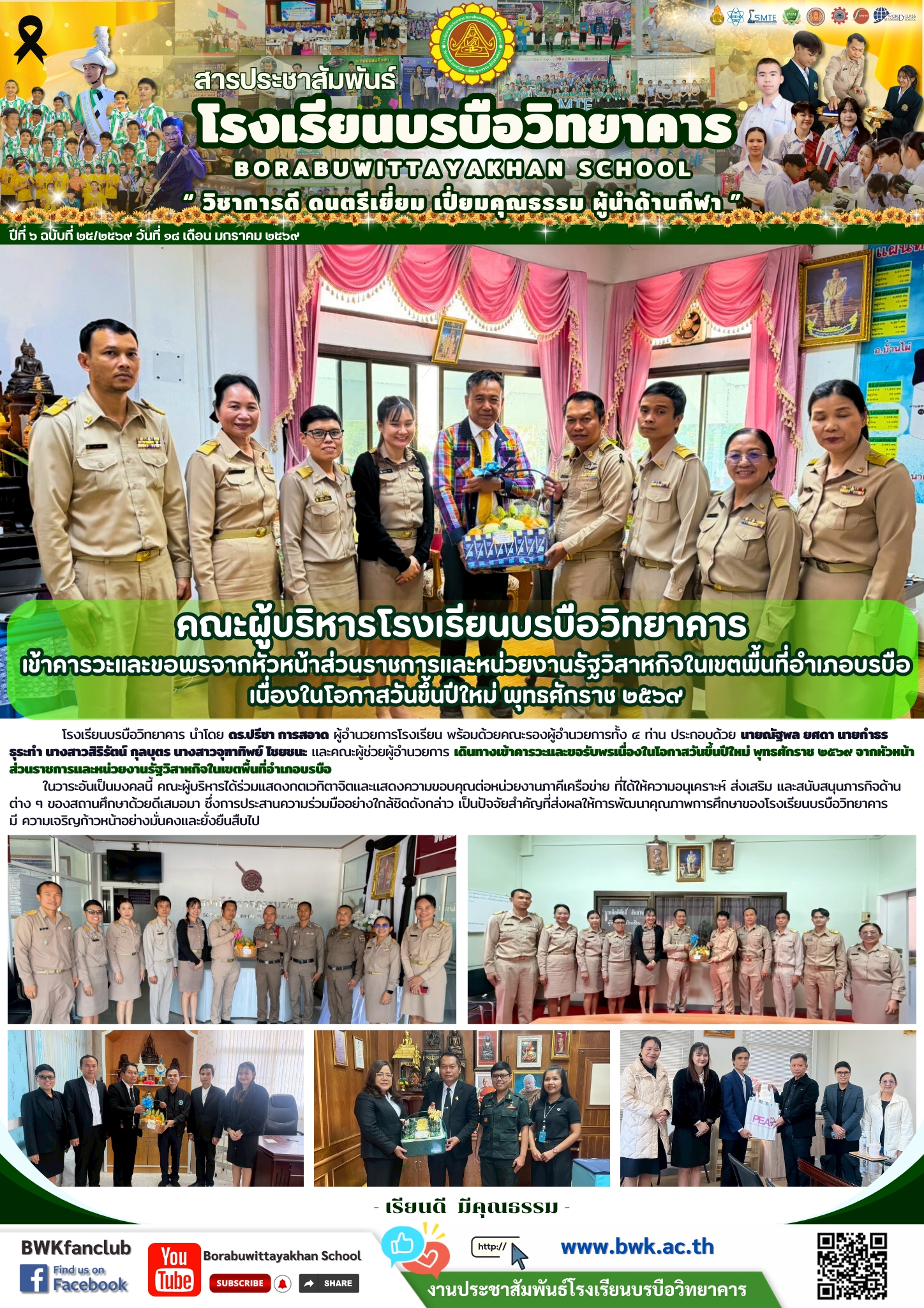 โรงเรียนบรบือวิทยาคาร นำโดย ดร.ปรีชา การสอาด ผู้อำนวยการโรงเรียน พร้อมด้วยคณะรองผู้อำนวยการทั้ง ๔ ท่าน ประกอบด้วย นายณัฐพล ยศดา นายกำธร ธุระทำ นางสาวสิริรัตน์ กุลบุตร นางสาวจุฑาทิพย์ ไชยชนะ และคณะผู้ช่วยผู้อำนวยการ เดินทางเข้าคารวะและขอรับพรเนื่องในโอกาสวันขึ้นปีใหม่ พุทธศักราช ๒๕๖๙ จากหัวหน้าส่วนราชการและหน่วยงานรัฐวิสาหกิจในเขตพื้นที่อำเภอบรบือ