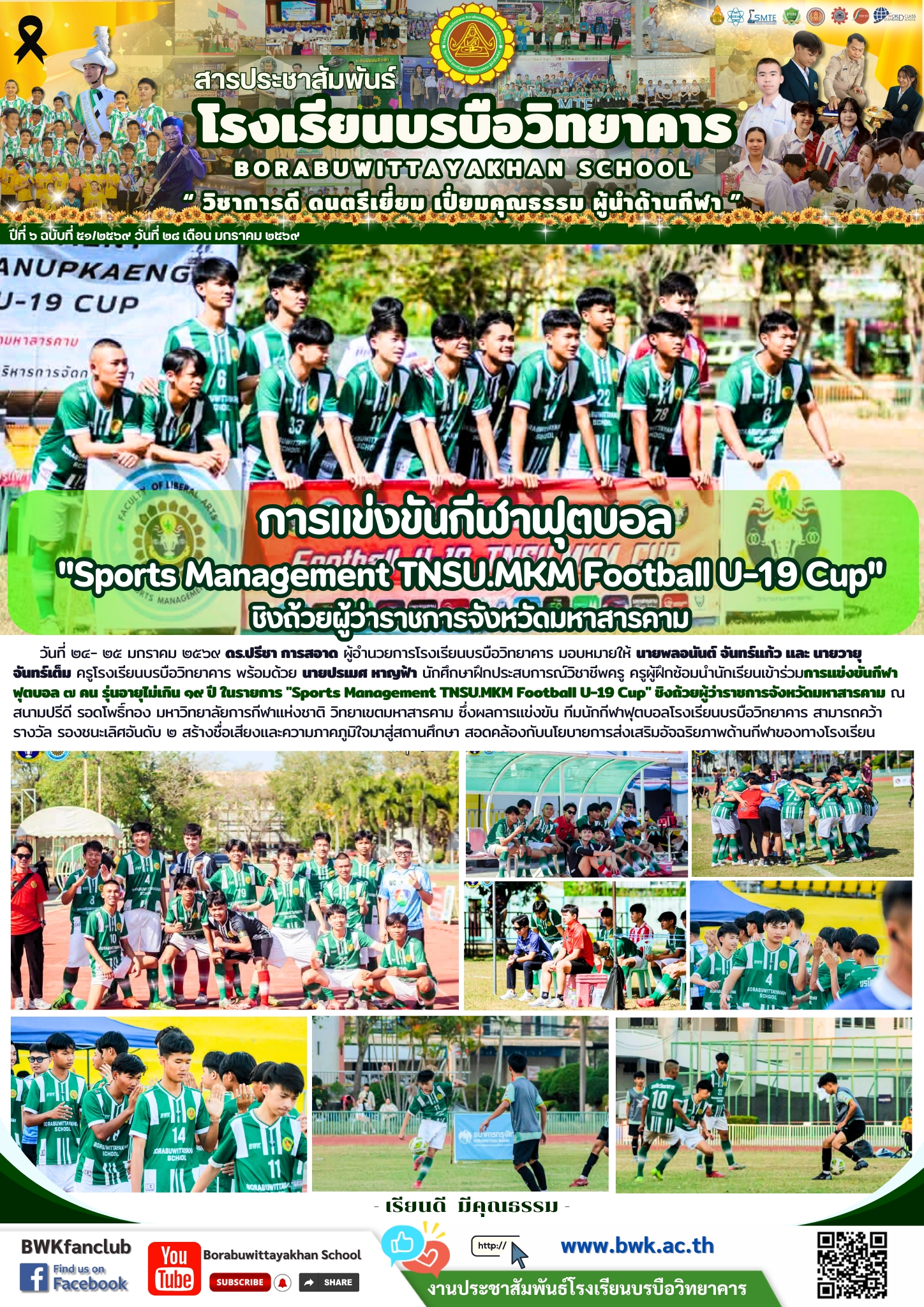 วันที่ ๒๔- ๒๕ มกราคม ๒๕๖๙ ดร.ปรีชา การสอาด ผู้อำนวยการโรงเรียนบรบือวิทยาคาร มอบหมายให้ นายพลอนันต์ จันทร์แก้ว และ นายวายุ     จันทร์เต็ม ครูโรงเรียนบรบือวิทยาคาร พร้อมด้วย นายปรเมศ หาญฟ้า นักศึกษาฝึกประสบการณ์วิชาชีพครู ครูผู้ฝึกซ้อมนำนักเรียนเข้าร่วมการแข่งขันกีฬาฟุตบอล ๗ คน รุ่นอายุไม่เกิน ๑๙ ปี ในรายการ "Sports Management TNSU.MKM Football U-19 Cup" ชิงถ้วยผู้ว่าราชการจังหวัดมหาสารคาม ณ สนามปรีดี รอดโพธิ์ทอง มหาวิทยาลัยการกีฬาแห่งชาติ วิทยาเขตมหาสารคาม ซึ่งผลการแข่งขัน ทีมนักกีฬาฟุตบอลโรงเรียนบรบือวิทยาคาร สามารถคว้ารางวัล รองชนะเลิศอันดับ ๒ สร้างชื่อเสียงและความภาคภูมิใจมาสู่สถานศึกษา สอดคล้องกับนโยบายการส่งเสริมอัจฉริยภาพด้านกีฬาของทางโรงเรียน