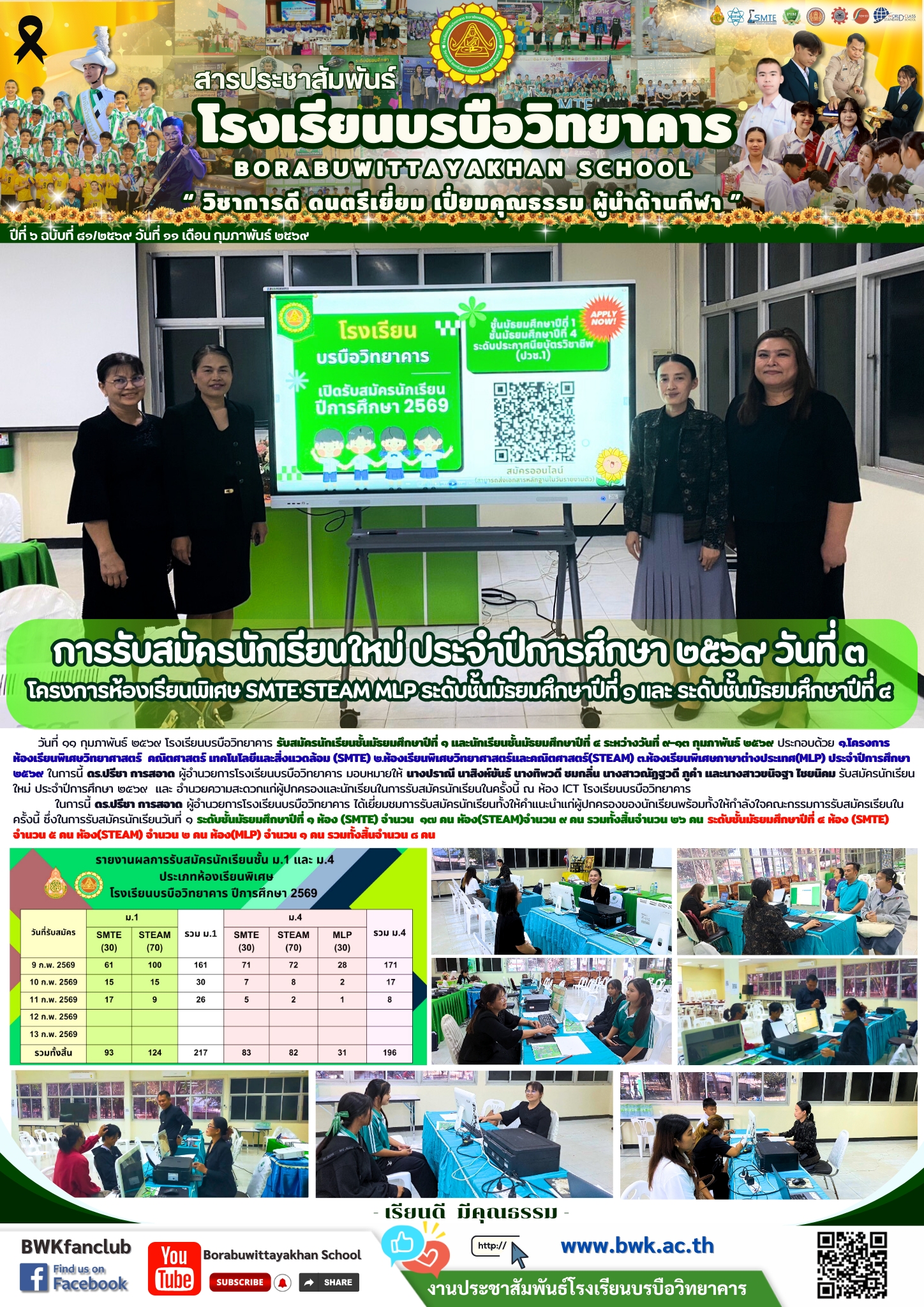 วันที่ ๑๐ กุมภาพันธ์ ๒๕๖๙ โรงเรียนบรบือวิทยาคาร รับสมัครนักเรียนชั้นมัธยมศึกษาปีที่ ๑ และนักเรียนชั้นมัธยมศึกษาปีที่ ๔ ระหว่างวันที่ ๙-๑๓ กุมภาพันธ์ ๒๕๖๙ ประกอบด้วย ๑.โครงการห้องเรียนพิเศษวิทยาศาสตร์ คณิตศาสตร์ เทคโนโลยีและสิ่งแวดล้อม (SMTE) ๒.ห้องเรียนพิเศษวิทยาศาสตร์และคณิตศาสตร์(STEAM) ๓.ห้องเรียนพิเศษภาษาต่างประเทศ(MLP) ประจำปีการศึกษา ๒๕๖๙ ในการนี้ ดร.ปรีชา การสอาด ผู้อำนวยการโรงเรียนบรบือวิทยาคาร มอบหมายให้ นางปราณี นาสิงห์ขันธ์ นางทิพวดี ชมกลิ่น นางสาวณัฏฐวดี ภูคำ และนางสาวขนิจฐา ไชยนิคม รับสมัครนักเรียนใหม่ ประจำปีการศึกษา ๒๕๖๙ และ อำนวยความสะดวกแก่ผู้ปกครองและนักเรียนในการรับสมัครนักเรียนในครั้งนี้ ณ ห้อง ICT โรงเรียนบรบือวิทยาคาร ในการนี้ ดร.ปรีชา การสอาด ผู้อำนวยการโรงเรียนบรบือวิทยาคาร ได้เยี่ยมชมการรับสมัครนักเรียนทั้งให้คำแนะนำแก่ผู้ปกครองของนักเรียนพร้อมทั้งให้กำลังใจคณะกรรมการรับสมัครเรียนในครั้งนี้ ซึ่งในการรับสมัครนักเรียนวันที่ ๑ ระดับชั้นมัธยมศึกษาปีที่ ๑ ห้อง (SMTE) จำนวน ๑๗ คน หัอง(STEAM)จำนวน ๙ คน รวมทั้งสิ้นจำนวน ๒๖ คน ระดับชั้นมัธยมศึกษาปีที่ ๔ ห้อง (SMTE) จำนวน ๕ คน หัอง(STEAM) จำนวน ๒ คน ห้อง(MLP) จำนวน ๑ คน รวมทั้งสิ้นจำนวน ๘ คน