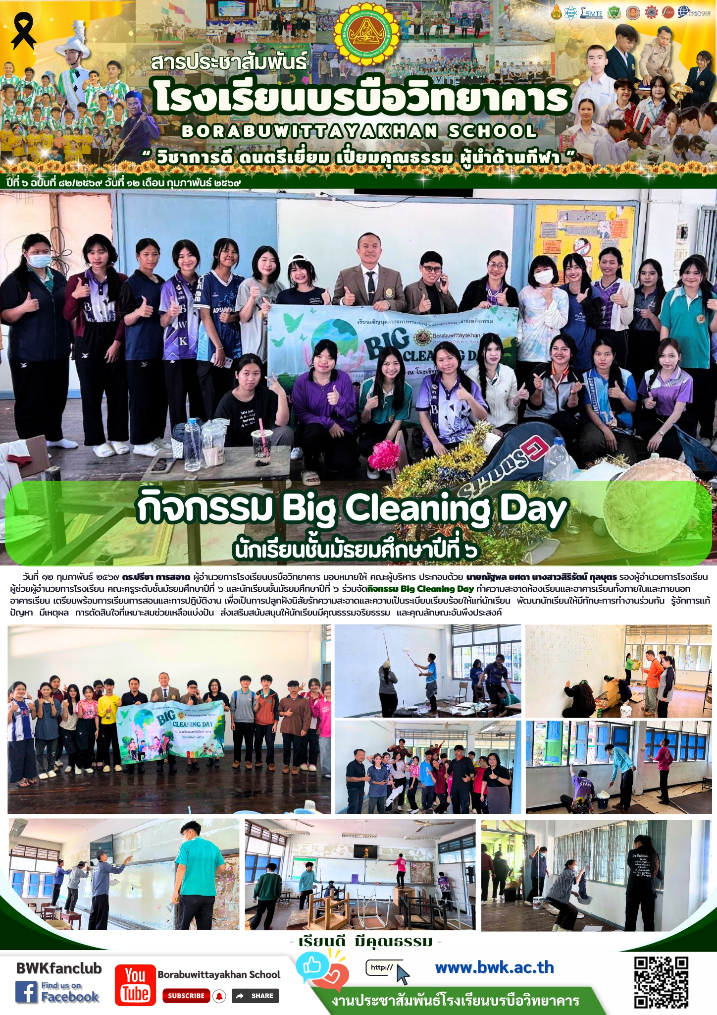 วันที่ ๑๒ กุมภาพันธ์ ๒๕๖๙ ดร.ปรีชา การสอาด ผู้อำนวยการโรงเรียนบรบือวิทยาคาร มอบหมายให้ คณะผู้บริหาร ประกอบด้วย นายณัฐพล ยศดา นางสาวสิริรัตน์ กุลบุตร รองผู้อำนวยการโรงเรียน ผู้ช่วยผู้อำนวยการโรงเรียน คณะครูระดับชั้นมัธยมศึกษาปีที่ ๖ และนักเรียนชั้นมัธยมศึกษาปีที่ ๖ ร่วมจัดกิจกรรม Big Cleaning Day ทำความสะอาดห้องเรียนและอาคารเรียนทั้งภายในและภายนอกอาคารเรียน เตรียมพร้อมการเรียนการสอนและการปฎิบัติงาน เพื่อเป็นการปลูกฝังนิสัยรักความสะอาดและความเป็นระเบียบเรียบร้อยให้แก่นักเรียน พัฒนานักเรียนให้มีทักษะการทำงานร่วมกัน รู้จักการแก้ปัญหา มีเหตุผล การตัดสินใจที่เหมาะสมช่วยเหลือแบ่งปัน ส่งเสริมสนับสนุนให้นักเรียนมีคุณธรรมจริยธรรม และคุณลักษณะอันพึงประสงค์