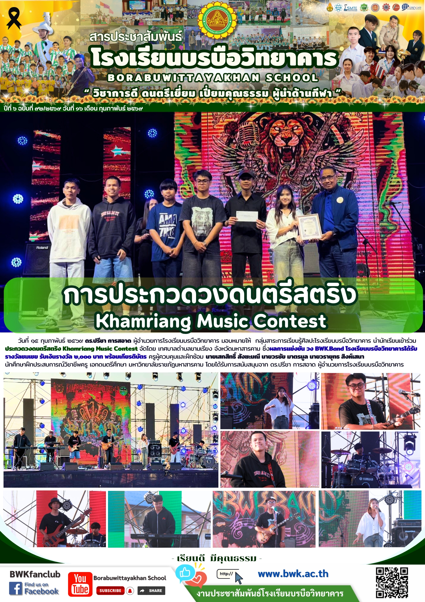 วันที่ ๑๕ กุมภาพันธ์ ๒๕๖๙ ดร.ปรีชา การสอาด ผู้อำนวยการโรงเรียนบรบือวิทยาคาร มอบหมายให้ กลุ่มสาระการเรียนรู้ศิลปะโรงเรียนบรบือวิทยาคาร นำนักเรียนเข้าร่วมประกวดวงดนตรีสตริง Khamriang Music Contest จัดโดย เทศบาลตำบลขามเรียง จังหวัดมหาสารคาม ซึ่งผลการแข่งขัน วง BWK.Band โรงเรียนบรบือวิทยาคารได้รับรางวัลชมเชย รับเงินรางวัล ๒,๐๐๐ บาท พร้อมเกียรติบัตร ครูผู้ควบคุมและฝึกซ้อม นายเสกสิทธิ์ สังฆะมณี นายวรชัย มาตรมูล นายวรายุทธ สิงห์เสนา นักศึกษาฝึกประสบการณ์วิชาชีพครู เอกดนตรีศึกษา มหาวิทยาลัยราชภัฏมหาสารคาม โดยได้รับการสนับสนุนจาก ดร.ปรีชา การสอาด ผู้อำนวยการโรงเรียนบรบือวิทยาคาร