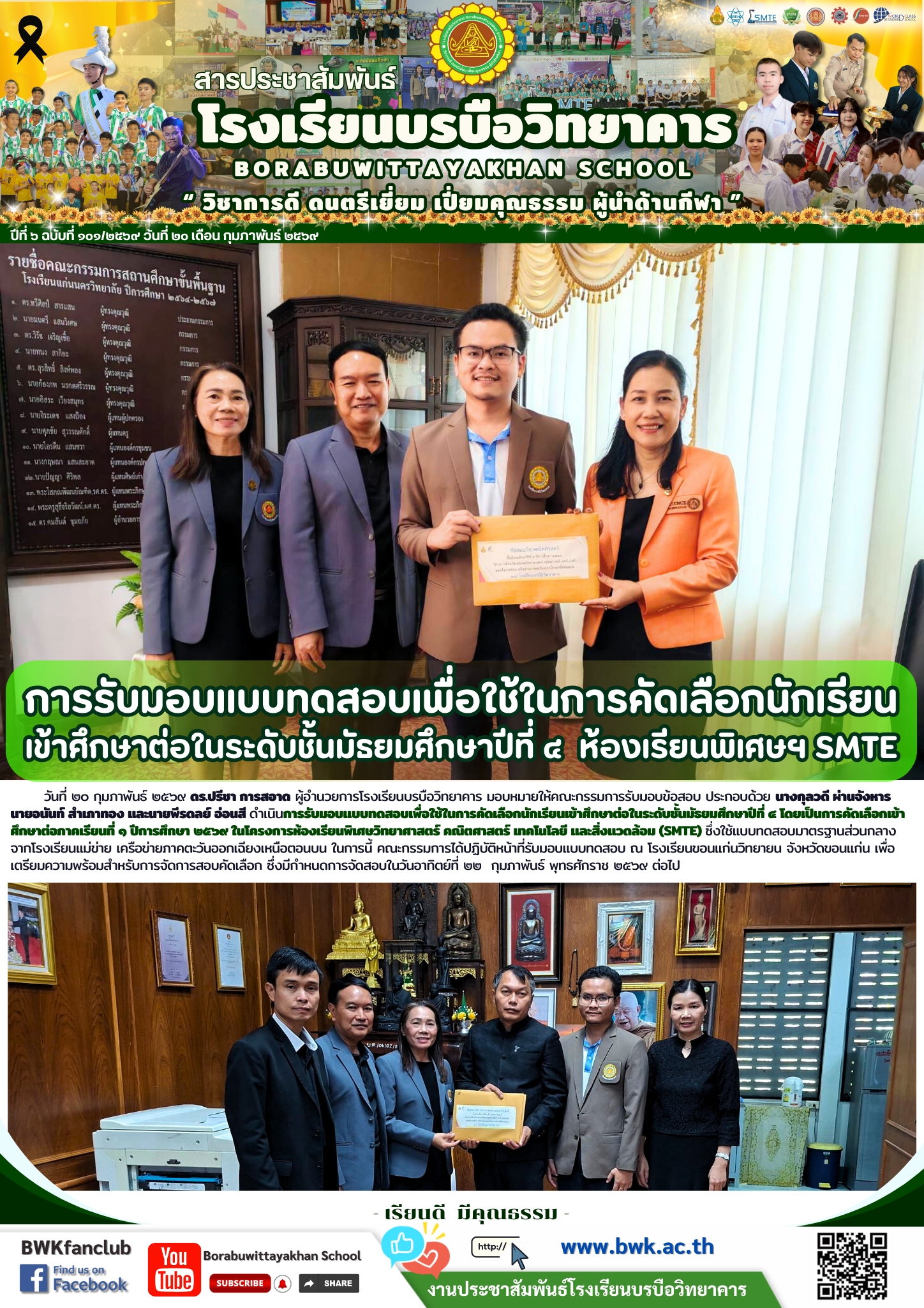 วันที่ ๒๐ กุมภาพันธ์​ ๒๕๖๙ ดร.ปรีชา การสอาด ผู้อำนวยการโรงเรียนบรบือวิทยาคาร มอบหมายให้คณะกรรมการรับมอบข้อสอบ ประกอบด้วย นางกุลวดี ผ่านจังหาร  นายอนันท์ สำเภาทอง และนายพีรดลย์ อ่อนสี ดำเนินการรับมอบแบบทดสอบเพื่อใช้ในการคัดเลือกนักเรียนเข้าศึกษาต่อในระดับชั้นมัธยมศึกษาปีที่ ๔ โดยเป็นการคัดเลือกเข้าศึกษาต่อภาคเรียนที่ ๑ ปีการศึกษา ๒๕๖๙ ในโครงการห้องเรียนพิเศษวิทยาศาสตร์ คณิตศาสตร์ เทคโนโลยี และสิ่งแวดล้อม (SMTE) ซึ่งใช้แบบทดสอบมาตรฐานส่วนกลางจากโรงเรียนแม่ข่าย เครือข่ายภาคตะวันออกเฉียงเหนือตอนบน ในการนี้ คณะกรรมการได้ปฏิบัติหน้าที่รับมอบแบบทดสอบ ณ โรงเรียนขอนแก่นวิทยายน จังหวัดขอนแก่น เพื่อเตรียมความพร้อมสำหรับการจัดการสอบคัดเลือก ซึ่งมีกำหนดการจัดสอบในวันอาทิตย์ที่ ๒๒  กุมภาพันธ์ พุทธศักราช ๒๕๖๙ ต่อไป