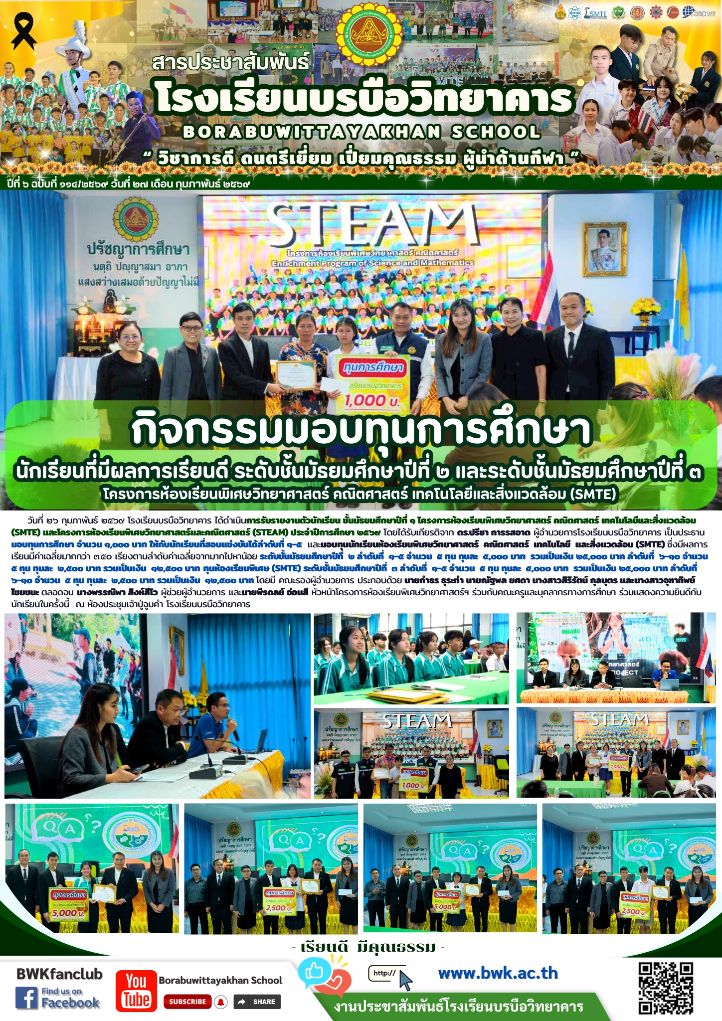 วันที่ ๒๖ กุมภาพันธ์ ๒๕๖๙ โรงเรียนบรบือวิทยาคาร ได้ดำเนินการรับรายงานตัวนักเรียน ชั้นมัธยมศึกษาปีที่ ๑ โครงการห้องเรียนพิเศษวิทยาศาสตร์ คณิตศาสตร์ เทคโนโลยีและสิ่งแวดล้อม (SMTE) และโครงการห้องเรียนพิเศษวิทยาศาสตร์และคณิตศาสตร์ (STEAM) ประจำปีการศึกษา ๒๕๖๙ โดยได้รับเกียรติจาก ดร.ปรีชา การรสอาด ผู้อำนวยการโรงเรียนบรบือวิทยาคาร เป็นประธาน มอบทุนการศึกษา จำนวน ๑,๐๐๐ บาท ให้กับนักเรียนที่สอบแข่งขันได้ลำดับที่ ๑-๕  และมอบทุนนักเรียนห้องเรียนพิเศษวิทยาศาสตร์  คณิตศาสตร์  เทคโนโลยี  และสิ่งแวดล้อม (SMTE) ซึ่งมีผลการเรียนมีค่าเฉลี่ยมากกว่า ๓.๕๐ เรียงตามลำดับค่าเฉลี่ยจากมากไปหาน้อย ระดับชั้นมัธยมศึกษาปีที่  ๒ ลำดับที่  ๑-๕ จำนวน  ๕ ทุน ทุนละ  ๕,๐๐๐ บาท  รวมเป็นเงิน ๒๕,๐๐๐ บาท ลำดับที่ ๖-๑๐ จำนวน ๕ ทุน ทุนละ ๒,๕๐๐ บาท รวมเป็นเงิน  ๑๒,๕๐๐ บาท ทุนห้องเรียนพิเศษ (SMTE) ระดับชั้นมัธยมศึกษาปีที่ ๓ ลำดับที่ ๑-๕ จำนวน ๕ ทุน ทุนละ ๕,๐๐๐ บาท  รวมเป็นเงิน ๒๕,๐๐๐ บาท ลำดับที่  ๖-๑๐ จำนวน  ๕ ทุน ทุนละ  ๒,๕๐๐ บาท รวมเป็นเงิน  ๑๒,๕๐๐ บาท โดยมี คณะรองผู้อำนวยการ ประกอบด้วย นายกำธร ธุระทำ นายณัฐพล ยศดา นางสาวสิริรัตน์ กุลบุตร และนางสาวจุฑาทิพย์ ไชยชนะ ตลอดจน นางพรรณิพา สิงห์สีโว ผู้ช่วยผู้อำนวยการ และนายพีรดลย์ อ่อนสี หัวหน้าโครงการห้องเรียนพิเศษวิทยาศาสตร์ฯ ร่วมกับคณะครูและบุคลากรทางการศึกษา ร่วมแสดงความยินดีกับนักเรียนในครั้งนี้  ณ ห้องประชุมเจ้าปู่จูมคำ โรงเรียนบรบือวิทยาคาร