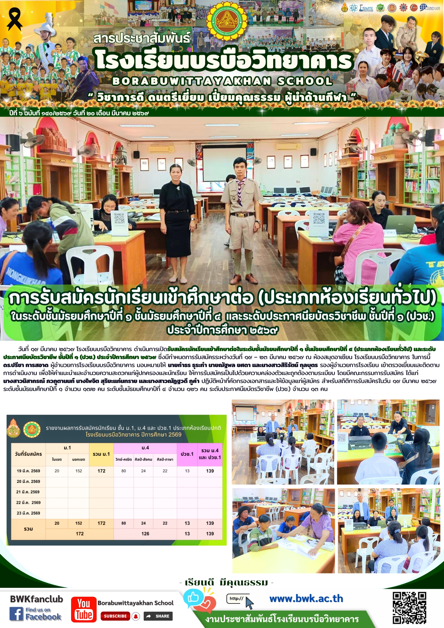 วันที่ ๑๙ มีนาคม ๒๕๖๙ โรงเรียนบรบือวิทยาคาร ดำเนินการเปิดรับสมัครนักเรียนเข้าศึกษาต่อในระดับชั้นมัธยมศึกษาปีที่ ๑ ชั้นมัธยมศึกษาปีที่ ๔ (ประเภทห้องเรียนทั่วไป) และระดับประกาศนียบัตรวิชาชีพ ชั้นปีที่ ๑ (ปวช.) ประจำปีการศึกษา ๒๕๖๙ ซึ่งมีกำหนดการรับสมัครระหว่างวันที่ ๑๙ – ๒๓ มีนาคม ๒๕๖๙ ณ ห้องสมุดอาเซียน โรงเรียนบรบือวิทยาคาร ในการนี้ ดร.ปรีชา การสอาด ผู้อำนวยการโรงเรียนบรบือวิทยาคาร มอบหมายให้ นายกำธร ธุระทำ นายณัฐพล ยศดา และนางสาวสิริรัตน์ กุลบุตร รองผู้อำนวยการโรงเรียน เข้าตรวจเยี่ยมและติดตามการดำเนินงาน เพื่อให้คำแนะนำและอำนวยความสะดวกแก่ผู้ปกครองและนักเรียน ให้การรับสมัครเป็นไปด้วยความคล่องตัวและถูกต้องตามระเบียบ โดยมีคณะกรรมการรับสมัคร ได้แก่ นางสาวนิสากรณ์ ภวภูตานนท์ นางไพจิต สุริยะแก่นทราย และนางสาวณัฏฐวดี ภูคำ ปฏิบัติหน้าที่คัดกรองเอกสารและให้ข้อมูลแก่ผู้สมัคร สำหรับสถิติการรับสมัครในวัน ๑๙ มีนาคม ๒๕๖๙ ระดับชั้นมัธยมศึกษาปีที่ ๑ จำนวน ๑๗๒ คน ระดับชั้นมัธยมศึกษาปีที่ ๔ จำนวน ๑๒๖ คน ระดับประกาศนียบัตรวิชาชีพ (ปวช.) จำนวน ๑๓ คน