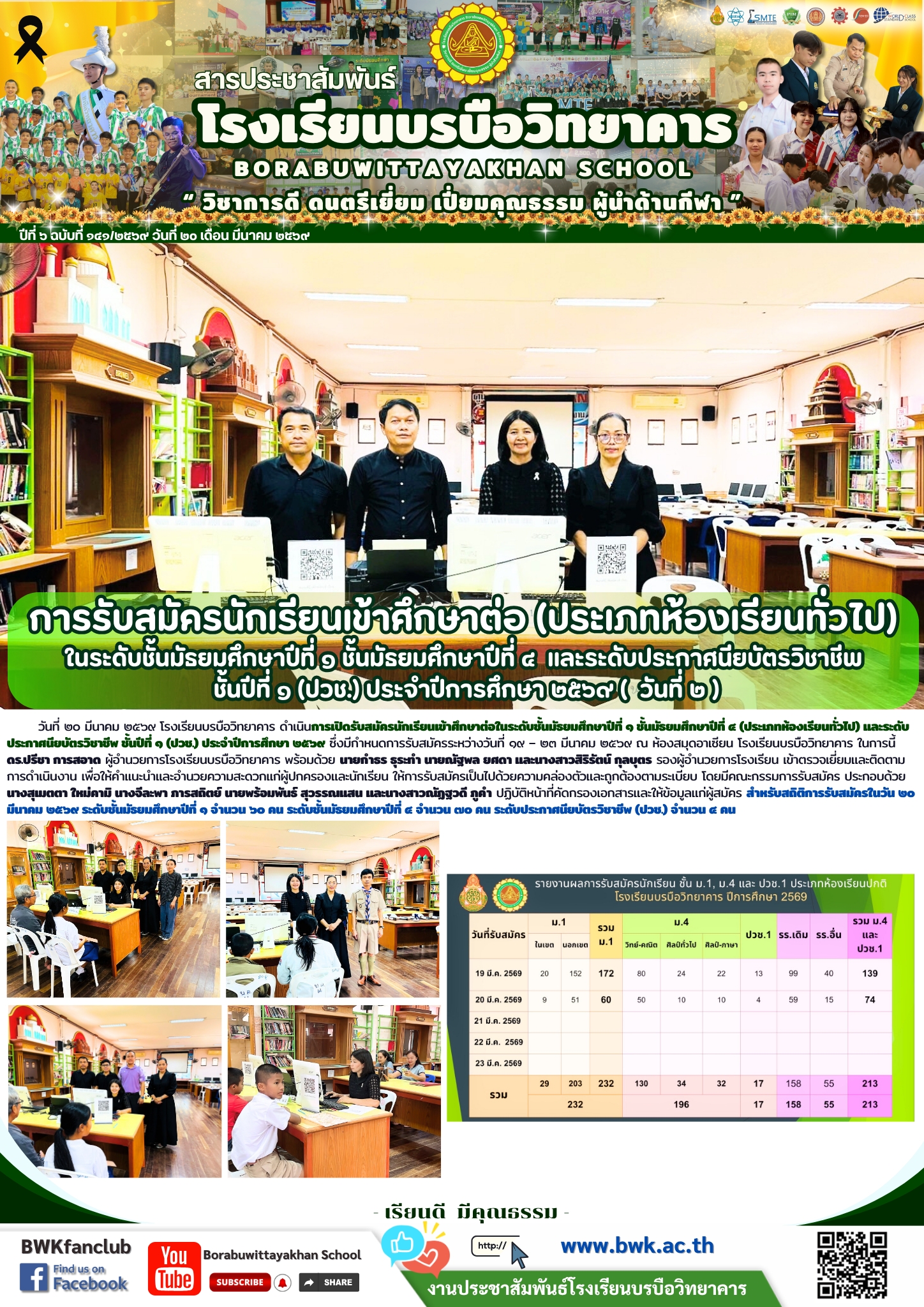 วันที่ ๒๐ มีนาคม ๒๕๖๙ โรงเรียนบรบือวิทยาคาร ดำเนินการเปิดรับสมัครนักเรียนเข้าศึกษาต่อในระดับชั้นมัธยมศึกษาปีที่ ๑ ชั้นมัธยมศึกษาปีที่ ๔ (ประเภทห้องเรียนทั่วไป) และระดับประกาศนียบัตรวิชาชีพ ชั้นปีที่ ๑ (ปวช.) ประจำปีการศึกษา ๒๕๖๙ ซึ่งมีกำหนดการรับสมัครระหว่างวันที่ ๑๙ – ๒๓ มีนาคม ๒๕๖๙ ณ ห้องสมุดอาเซียน โรงเรียนบรบือวิทยาคาร ในการนี้ ดร.ปรีชา การสอาด ผู้อำนวยการโรงเรียนบรบือวิทยาคาร พร้อมด้วย นายกำธร ธุระทำ นายณัฐพล ยศดา และนางสาวสิริรัตน์ กุลบุตร รองผู้อำนวยการโรงเรียน เข้าตรวจเยี่ยมและติดตามการดำเนินงาน เพื่อให้คำแนะนำและอำนวยความสะดวกแก่ผู้ปกครองและนักเรียน ให้การรับสมัครเป็นไปด้วยความคล่องตัวและถูกต้องตามระเบียบ โดยมีคณะกรรมการรับสมัคร ประกอบด้วย นางสุเมตตา ใหม่คามิ นางจีละพา ภารสถิตย์ นายพร้อมพันธ์ สุวรรณแสน และนางสาวณัฏฐวดี ภูคำ ปฏิบัติหน้าที่คัดกรองเอกสารและให้ข้อมูลแก่ผู้สมัคร สำหรับสถิติการรับสมัครในวัน ๒๐ มีนาคม ๒๕๖๙ ระดับชั้นมัธยมศึกษาปีที่ ๑ จำนวน ๖๐ คน ระดับชั้นมัธยมศึกษาปีที่ ๔ จำนวน ๗๐ คน ระดับประกาศนียบัตรวิชาชีพ (ปวช.) จำนวน ๔ คน