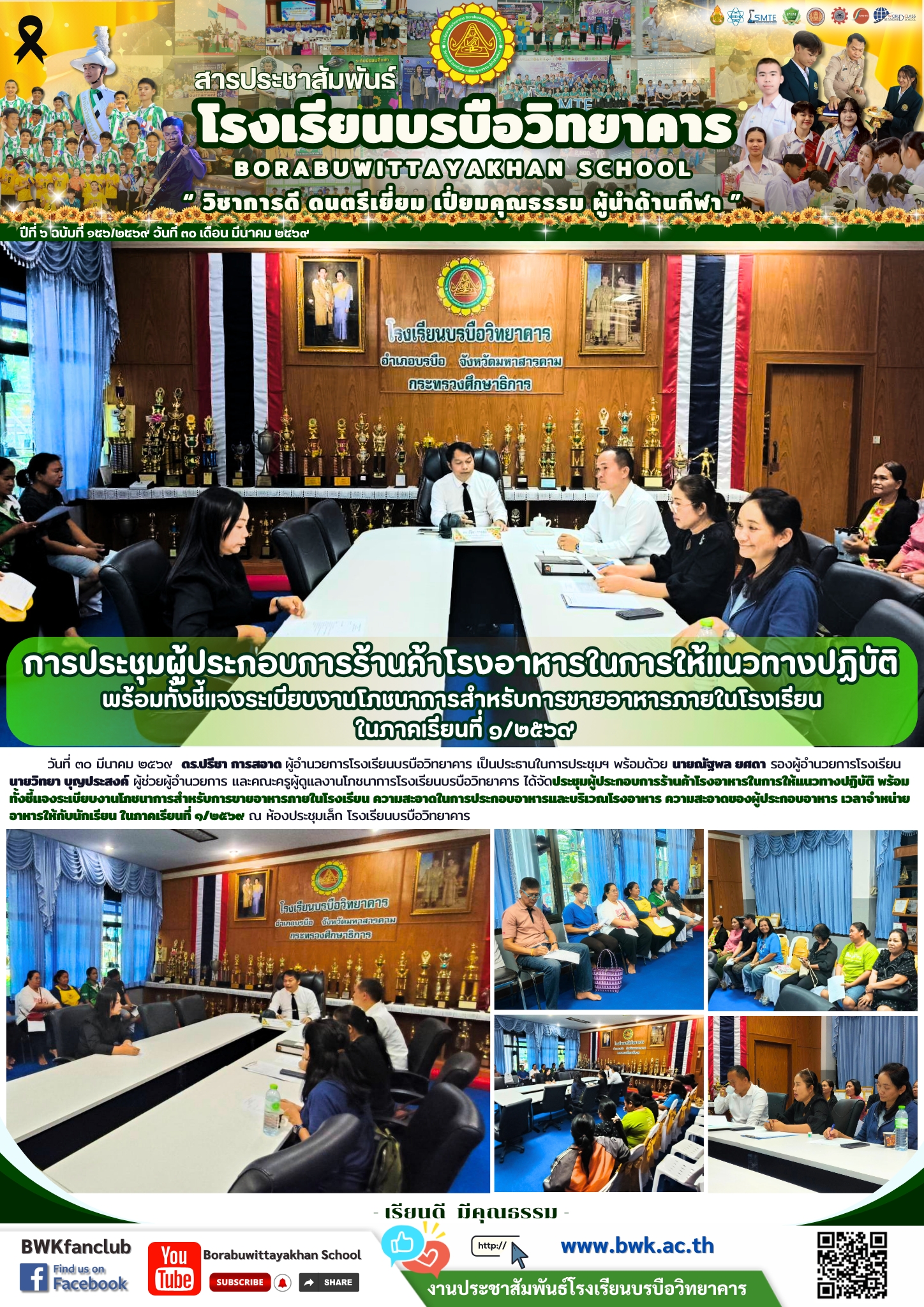 วันที่ ๓๐ มีนาคม ๒๕๖๙ ดร.ปรีชา การสอาด ผู้อำนวยการโรงเรียนบรบือวิทยาคาร เป็นประธานในการประชุมฯ พร้อมด้วย นายณัฐพล ยศดา รองผู้อำนวยการโรงเรียน นายวิทยา บุญประสงค์ ผู้ช่วยผู้อำนวยการ และคณะครูผู้ดูแลงานโภชนาการโรงเรียนบรบือวิทยาคาร ได้จัดประชุมผู้ประกอบการร้านค้าโรงอาหารในการให้แนวทางปฏิบัติ พร้อมทั้งชี้แจงระเบียบงานโภชนาการสำหรับการขายอาหารภายในโรงเรียน ความสะอาดในการประกอบอาหารและบริเวณโรงอาหาร ความสะอาดของผู้ประกอบอาหาร เวลาจำหน่ายอาหารให้กับนักเรียน ในภาคเรียนที่ ๑/๒๕๖๙ ณ ห้องประชุมเล็ก โรงเรียนบรบือวิทยาคาร