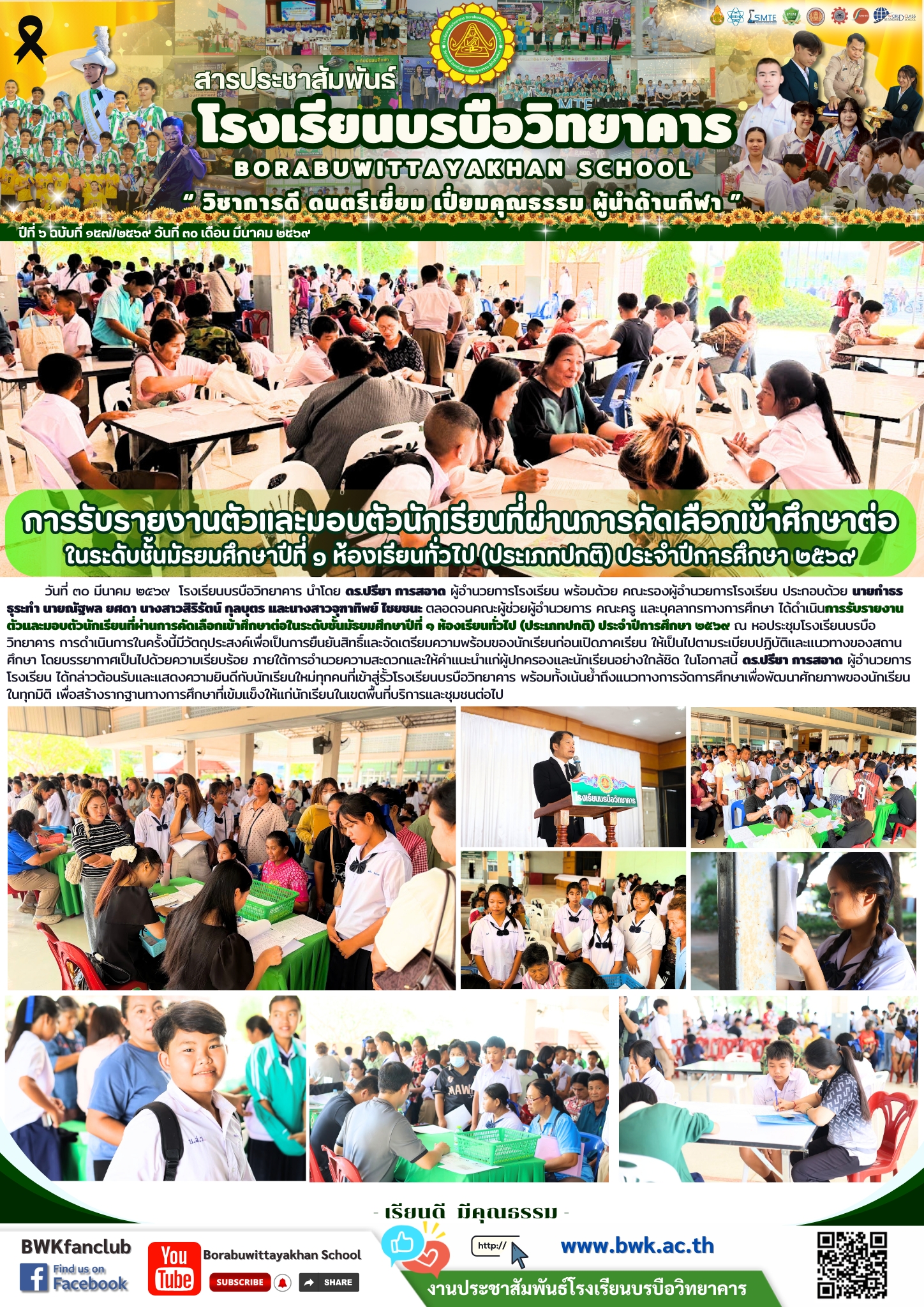 วันที่ ๓๐ มีนาคม ๒๕๖๙ โรงเรียนบรบือวิทยาคาร นำโดย ดร.ปรีชา การสอาด ผู้อำนวยการโรงเรียน พร้อมด้วย คณะรองผู้อำนวยการโรงเรียน ประกอบด้วย นายกำธร ธุระทำ นายณัฐพล ยศดา นางสาวสิริรัตน์ กุลบุตร และนางสาวจุฑาทิพย์ ไชยชนะ ตลอดจนคณะผู้ช่วยผู้อำนวยการ คณะครู และบุคลากรทางการศึกษา ได้ดำเนินการรับรายงานตัวและมอบตัวนักเรียนที่ผ่านการคัดเลือกเข้าศึกษาต่อในระดับชั้นมัธยมศึกษาปีที่ ๑ ห้องเรียนทั่วไป (ประเภทปกติ) ประจำปีการศึกษา ๒๕๖๙ ณ หอประชุมโรงเรียนบรบือวิทยาคาร การดำเนินการในครั้งนี้มีวัตถุประสงค์เพื่อเป็นการยืนยันสิทธิ์และจัดเตรียมความพร้อมของนักเรียนก่อนเปิดภาคเรียน ให้เป็นไปตามระเบียบปฏิบัติและแนวทางของสถานศึกษา โดยบรรยากาศเป็นไปด้วยความเรียบร้อย ภายใต้การอำนวยความสะดวกและให้คำแนะนำแก่ผู้ปกครองและนักเรียนอย่างใกล้ชิด ในโอกาสนี้ ดร.ปรีชา การสอาด ผู้อำนวยการโรงเรียน ได้กล่าวต้อนรับและแสดงความยินดีกับนักเรียนใหม่ทุกคนที่เข้าสู่รั้วโรงเรียนบรบือวิทยาคาร พร้อมทั้งเน้นย้ำถึงแนวทางการจัดการศึกษาเพื่อพัฒนาศักยภาพของนักเรียนในทุกมิติ เพื่อสร้างรากฐานทางการศึกษาที่เข้มแข็งให้แก่นักเรียนในเขตพื้นที่บริการและชุมชนต่อไป