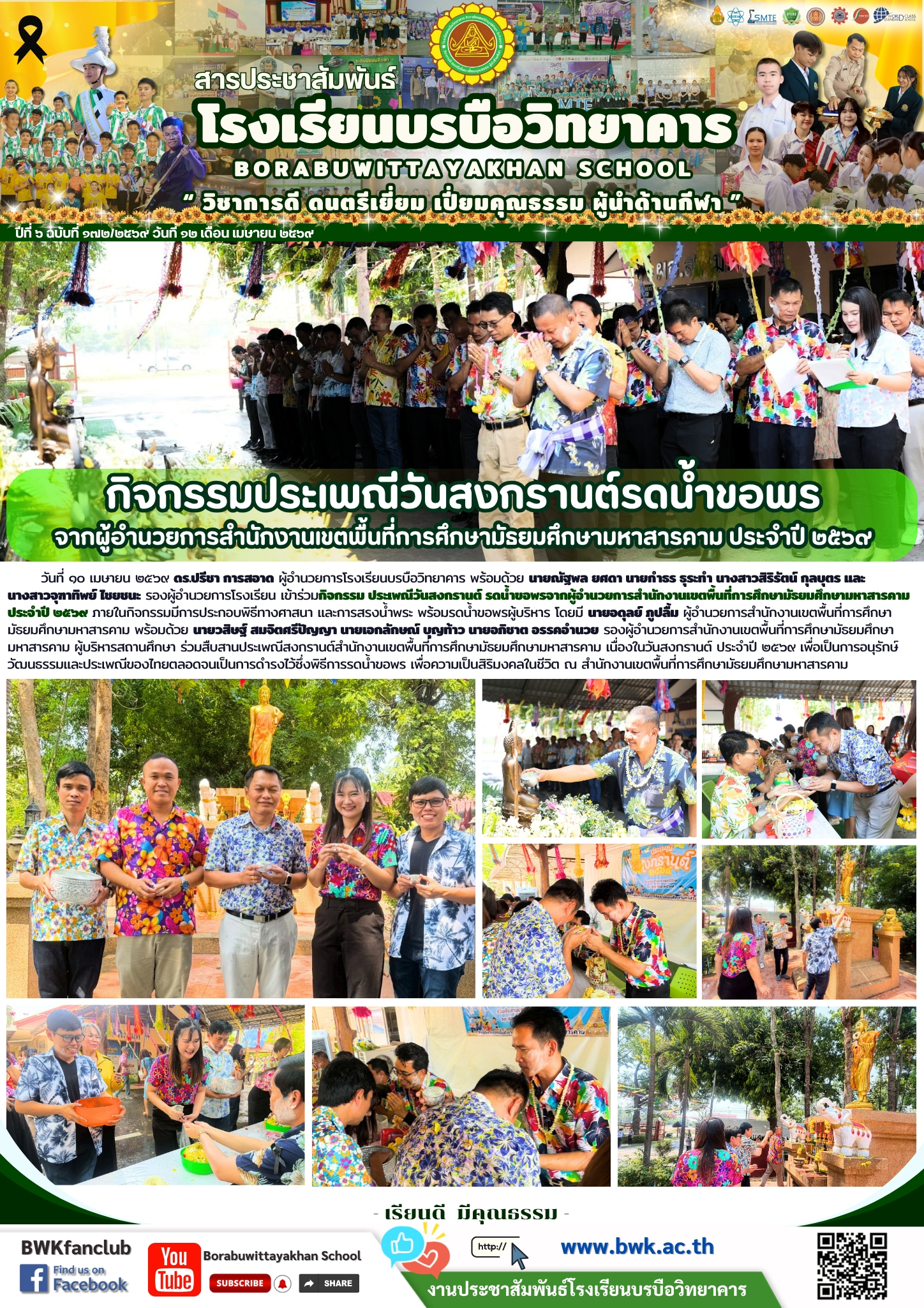 วันที่ ๑๐ เมษายน ๒๕๖๙ ดร.ปรีชา การสอาด ผู้อำนวยการโรงเรียนบรบือวิทยาคาร พร้อมด้วย นายณัฐพล ยศดา นายกำธร ธุระทำ นางสาวสิริรัตน์ กุลบุตร และนางสาวจุฑาทิพย์ ไชยชนะ รองผู้อำนวยการโรงเรียน เข้าร่วมกิจกรรม ประเพณีวันสงกรานต์ รดน้ำขอพรจากผู้อำนวยการสำนักงานเขตพื้นที่การศึกษามัธยมศึกษามหาสารคาม ประจำปี ๒๕๖๙ ภายในกิจกรรมมีการประกอบพิธีทางศาสนา และการสรงน้ำพระ พร้อมรดน้ำขอพรผู้บริหาร โดยมี นายอดุลย์ ภูปลื้ม ผู้อำนวยการสำนักงานเขตพื้นที่การศึกษามัธยมศึกษามหาสารคาม พร้อมด้วย นายวสิษฐ์ สมจิตศรีปัญญา นายเอกลักษณ์ บุญท้าว นายอภิชาต อรรคอำนวย รองผู้อำนวยการสำนักงานเขตพื้นที่การศึกษามัธยมศึกษามหาสารคาม ผู้บริหารสถานศึกษา ร่วมสืบสานประเพณีสงกรานต์สำนักงานเขตพื้นที่การศึกษามัธยมศึกษามหาสารคาม เนื่องในวันสงกรานต์ ประจำปี ๒๕๖๙ เพื่อเป็นการอนุรักษ์ วัฒนธรรมและประเพณีของไทยตลอดจนเป็นการดำรงไว้ซึ่งพิธีการรดน้ำขอพร เพื่อความเป็นสิริมงคลในชีวิต ณ สำนักงานเขตพื้นที่การศึกษามัธยมศึกษามหาสารคาม
