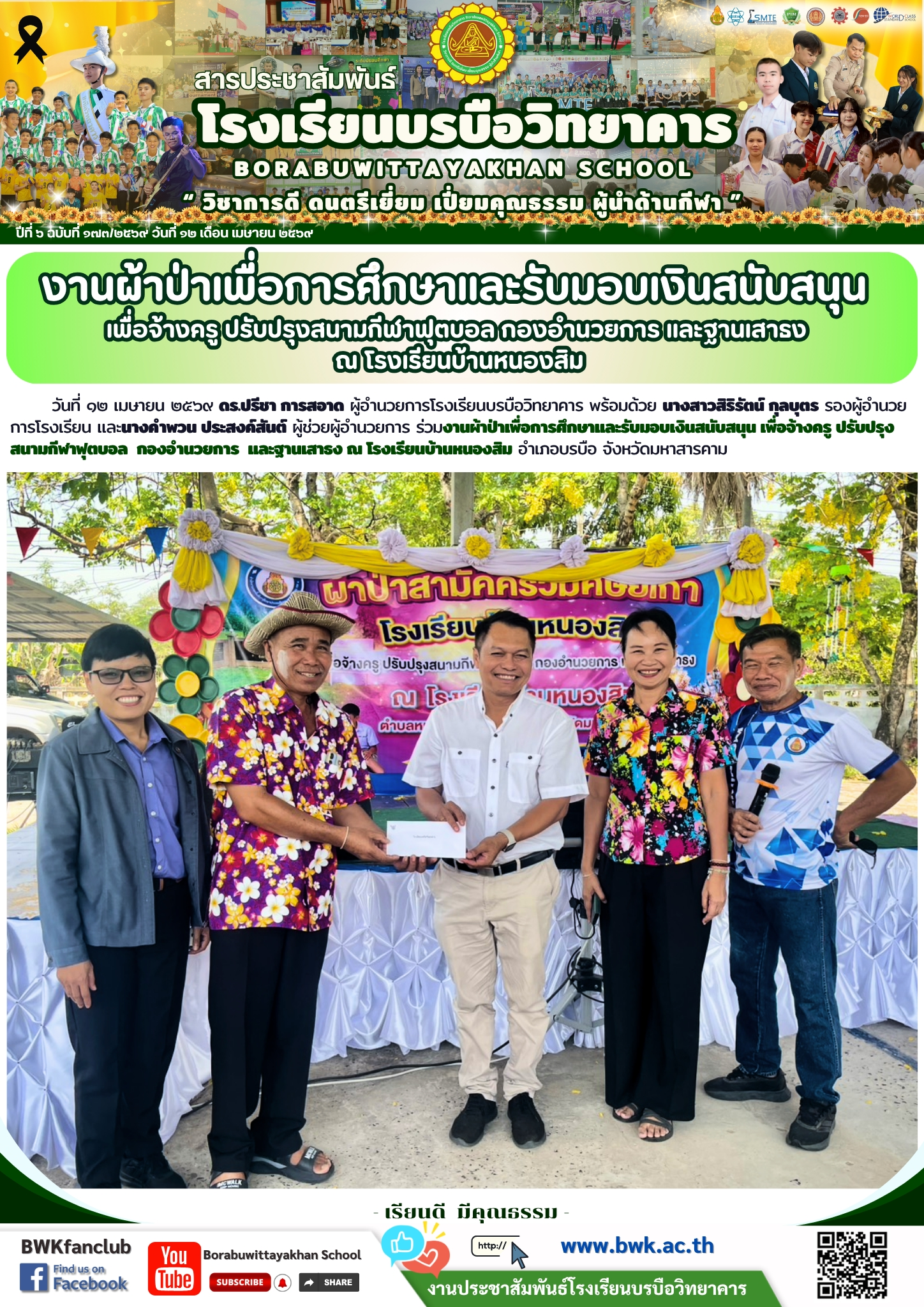 วันที่ ๑๒ เมษายน ๒๕๖๙ ดร.ปรีชา การสอาด ผู้อำนวยการโรงเรียนบรบือวิทยาคาร พร้อมด้วย นางสาวสิริรัตน์ กุลบุตร รองผู้อำนวยการโรงเรียน และนางคำพวน ประสงค์สันต์ ผู้ช่วยผู้อำนวยการ ร่วมงานผ้าป่าเพื่อการศึกษาและรับมอบเงินสนับสนุน เพื่อจ้างครู ปรับปรุงสนามกีฬาฟุตบอล กองอำนวยการ และฐานเสาธง ณ โรงเรียนบ้านหนองสิม อำเภอบรบือ จังหวัดมหาสารคาม