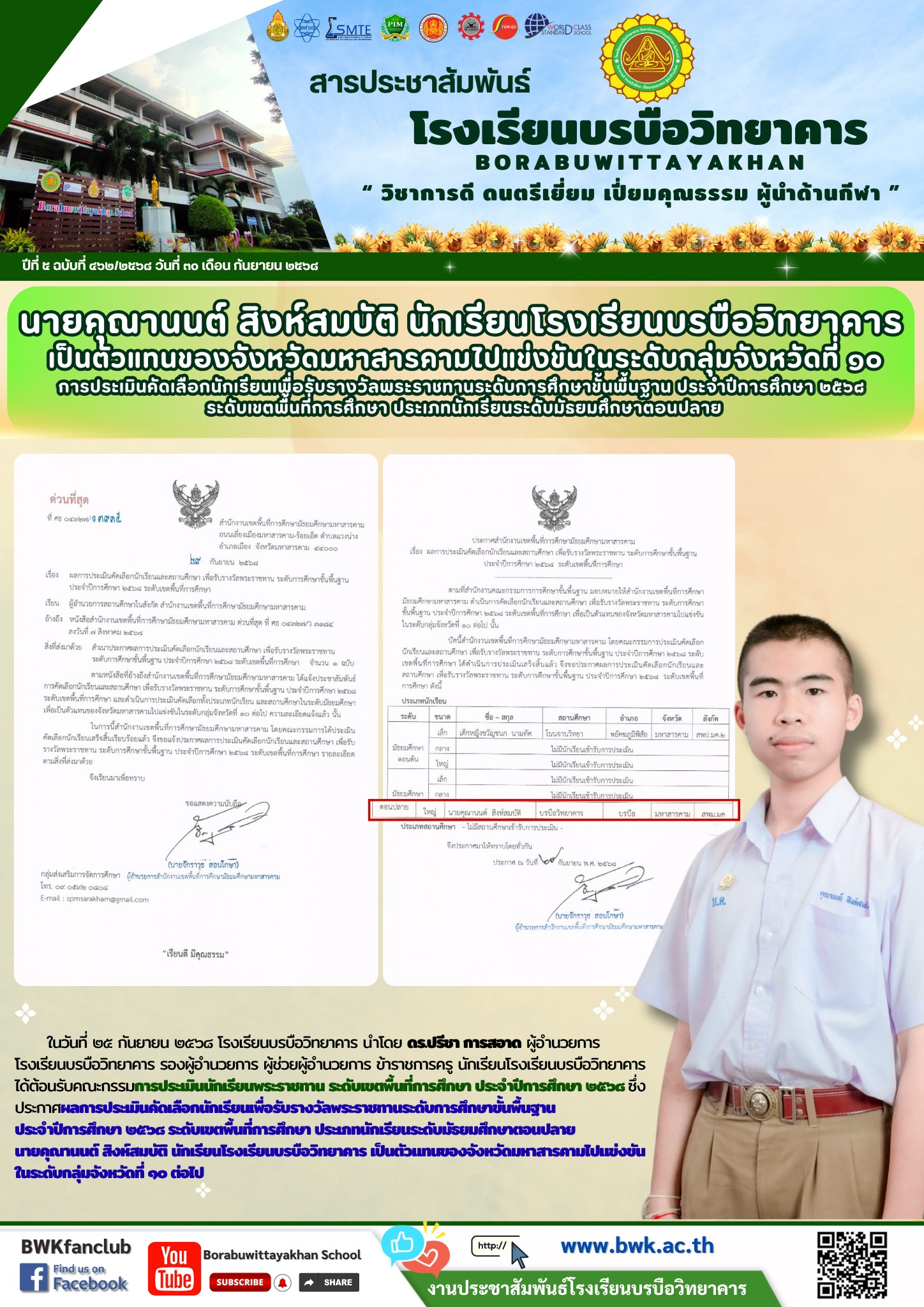 โรงเรียนบรบือวิทยาคารขอแสดงความยินดีกับ นายคุณานนต์ สิงห์สมบัติ นักเรียนชั้นมัธยมศึกษาปีที่ ๕/๑๐ โครงการห้องเรียนพิเศษ ฯ
