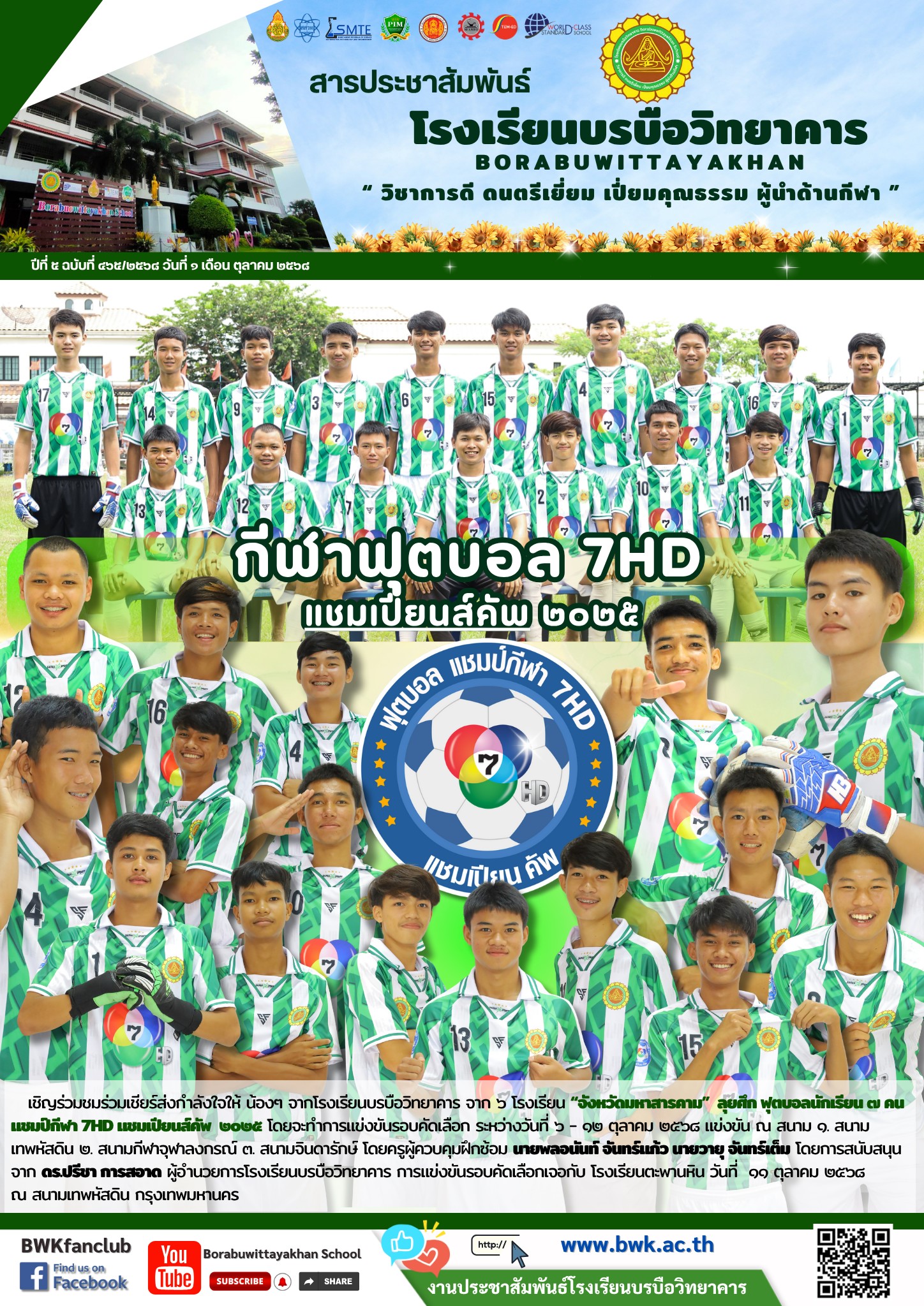 เชิญร่วมชมร่วมเชียร์ส่งกำลังใจให้ น้องๆ จากโรงเรียนบรบือวิทยาคาร จาก ๖ โรงเรียน “จังหวัดมหาสารคาม” ลุยศึก ฟุตบอลนักเรียน ๗ คน แชมป์กีฬา 7HD แชมเปียนส์คัพ ๒๐๒๕ โดยจะทำการแข่งขันรอบคัดเลือก ระหว่างวันที่ ๖ - ๑๒ ตุลาคม ๒๕๖๘ แข่งขัน ณ สนาม ๑. สนามเทพหัสดิน ๒. สนามกีฬาจุฬาลงกรณ์ ๓. สนามจินดารักษ์ โดยครูผู้ควบคุมฝึกซ้อม นายพลอนันท์ จันทร์แก้ว นายวายุ จันทร์เต็ม โดยการสนับสนุนจาก ดร.ปรีชา การสอาด ผู้อำนวยการโรงเรียนบรบือวิทยาคาร