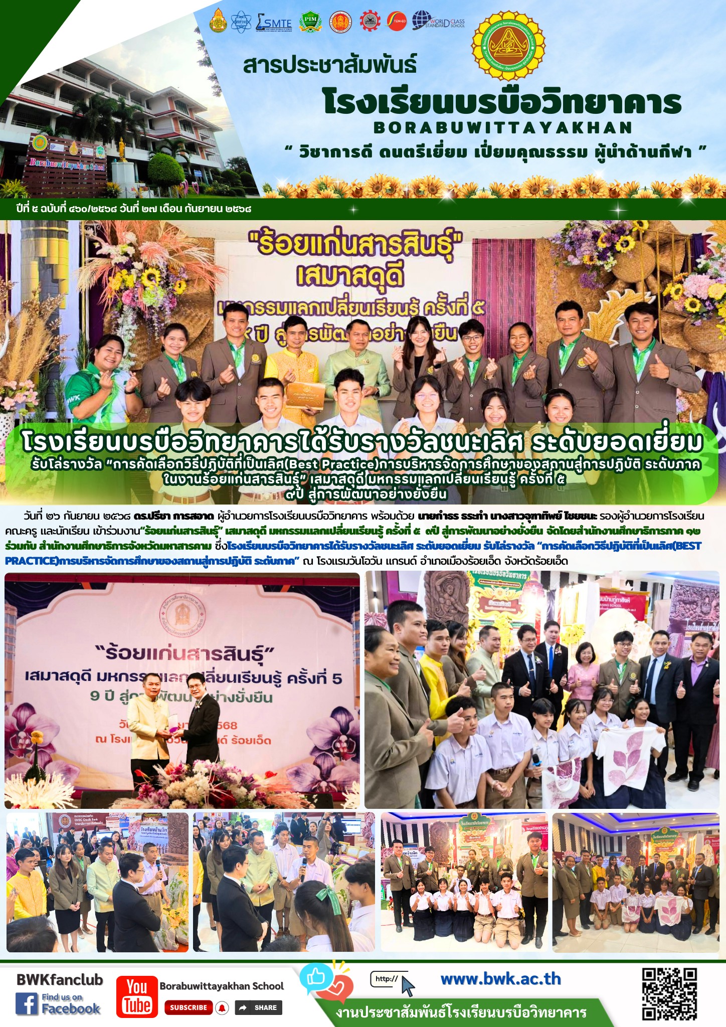 วันที่ ๒๖ กันยายน ๒๕๖๘ ดร.ปรีชา การสอาด ผู้อำนวยการโรงเรียนบรบือวิทยาคาร พร้อมด้วย นายกำธร ธระทำ นางสาวจุฑาทิพย์ ไชยชนะ รองผู้อำนวยการโรงเรียน คณะครู และนักเรียน เข้าร่วมงาน“ร้อยแก่นสารสินธุ์” เสมาสดุดี มหกรรมแลกเปลี่ยนเรียนรู้ ครั้งที่ ๕ ๙ปี สู่การพัฒนาอย่างยั่งยืน จัดโดยสำนักงานศึกษาธิการภาค ๑๒ ร่วมกับ สำนักงานศึกษาธิการจังหวัดมหาสารคาม ซึ่งโรงเรียนบรบือวิทยาคารได้รับรางวัลชนะเลิศ ระดับยอดเยี่ยม รับโล่รางวัล “การคัดเลือกวิธีปฏิบัติที่เป็นเลิศ(Best Practice)การบริหารจัดการศึกษาของสถานสู่การปฏิบัติ ระดับภาค” ณ โรงแรมวันโอวัน แกรนด์ อำเภอเมืองร้อยเอ็ด จังหวัดร้อยเอ็ด