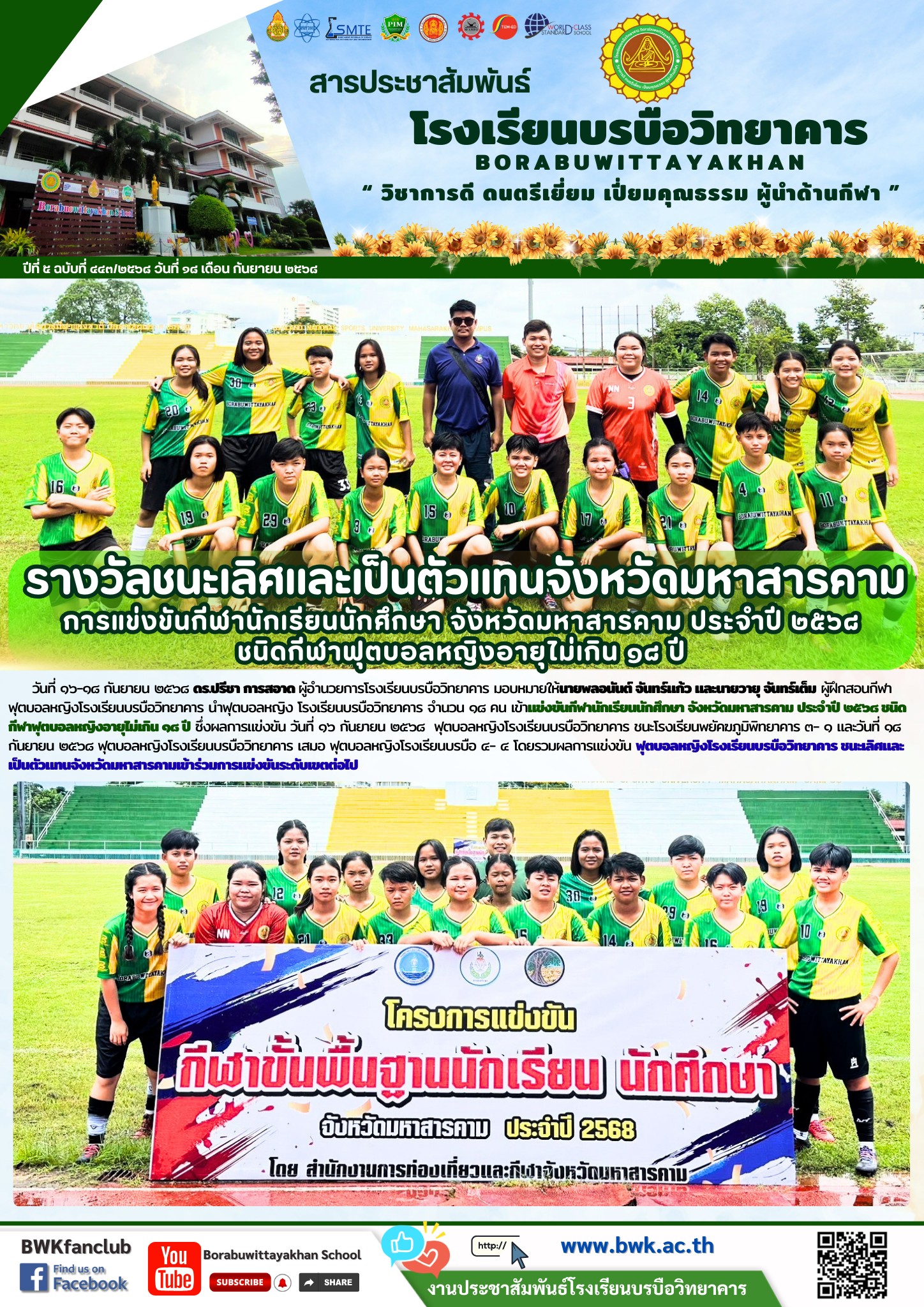 นที่ ๑๖-๑๘ กันยายน ๒๕๖๘ ดร.ปรีชา การสอาด ผู้อำนวยการโรงเรียนบรบือวิทยาคาร มอบหมายให้นายพลอนันต์ จันทร์แก้ว และนายวายุ จันทร์เต็ม ผู้ฝึกสอนกีฬาฟุตบอลหญิงโรงเรียนบรบือวิทยาคาร นำฟุตบอลหญิง โรงเรียนบรบือวิทยาคาร จำนวน ๑๘ คน เข้าแข่งขันกีฬานักเรียนนักศึกษา จังหวัดมหาสารคาม ประจำปี ๒๕๖๘ ชนิดกีฬาฟุตบอลหญิงอายุไม่เกิน ๑๘ ปี ซึ่งผลการแข่งขัน วันที่ ๑๖ กันยายน ๒๕๖๘ ฟุตบอลหญิงโรงเรียนบรบือวิทยาคาร ชนะโรงเรียนพยัคฆภูมิพิทยาคาร ๓- ๑ และวันที่ ๑๘ กันยายน ๒๕๖๘ ฟุตบอลหญิงโรงเรียนบรบือวิทยาคาร เสมอ ฟุตบอลหญิงโรงเรียนบรบือ ๔- ๔ โดยรวมผลการแข่งขัน ฟุตบอลหญิงโรงเรียนบรบือวิทยาคาร ชนะเลิศและเป็นตัวแทนจังหวัดมหาสารคามเข้าร่วมการแข่งขันระดับเขตต่อไป