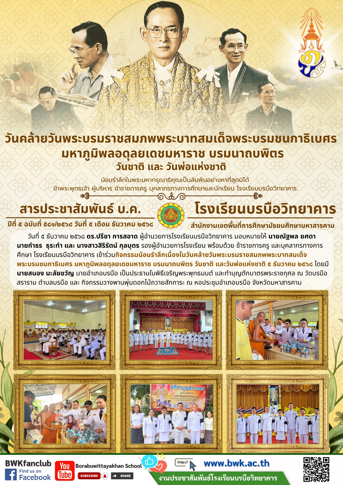 วันที่ ๕ ธันวาคม ๒๕๖๘ ดร.ปรีชา การสอาด ผู้อำนวยการโรงเรียนบรบือวิทยาคาร มอบหมายให้ นายณัฐพล ยศดา นายกำธร ธุระทำ และ นางสาวสิริรัตน์ กุลบุตร รองผู้อำนวยการโรงเรียน พร้อมด้วย ข้าราชการครู และบุคลากรทางการศึกษา โรงเรียนบรบือวิทยาคาร เข้าร่วมกิจกรรมน้อมรำลึกเนื่องในวันคล้ายวันพระบรมราชสมภพพระบาทสมเด็จ พระบรมชนกาธิเบศร มหาภูมิพลอดุลยเดชมหาราช บรมนาถบพิตร วันชาติ และวันพ่อแห่งชาติ ๕ ธันวาคม ๒๕๖๘ โดยมี นายสนอง มะลัยขวัญ นายอำเภอบรบือ เป็นประธานในพิธีเจริญพระพุทธมนต์ และทำบุญตักบาตรพระราชกุศล ณ วัดบรบือสราราม ตำบลบรบือ และ กิจกรรมวางพานพุ่มดอกไม้ถวายสักการะ ณ หอประชุมอำเภอบรบือ จังหวัดมหาสารคาม