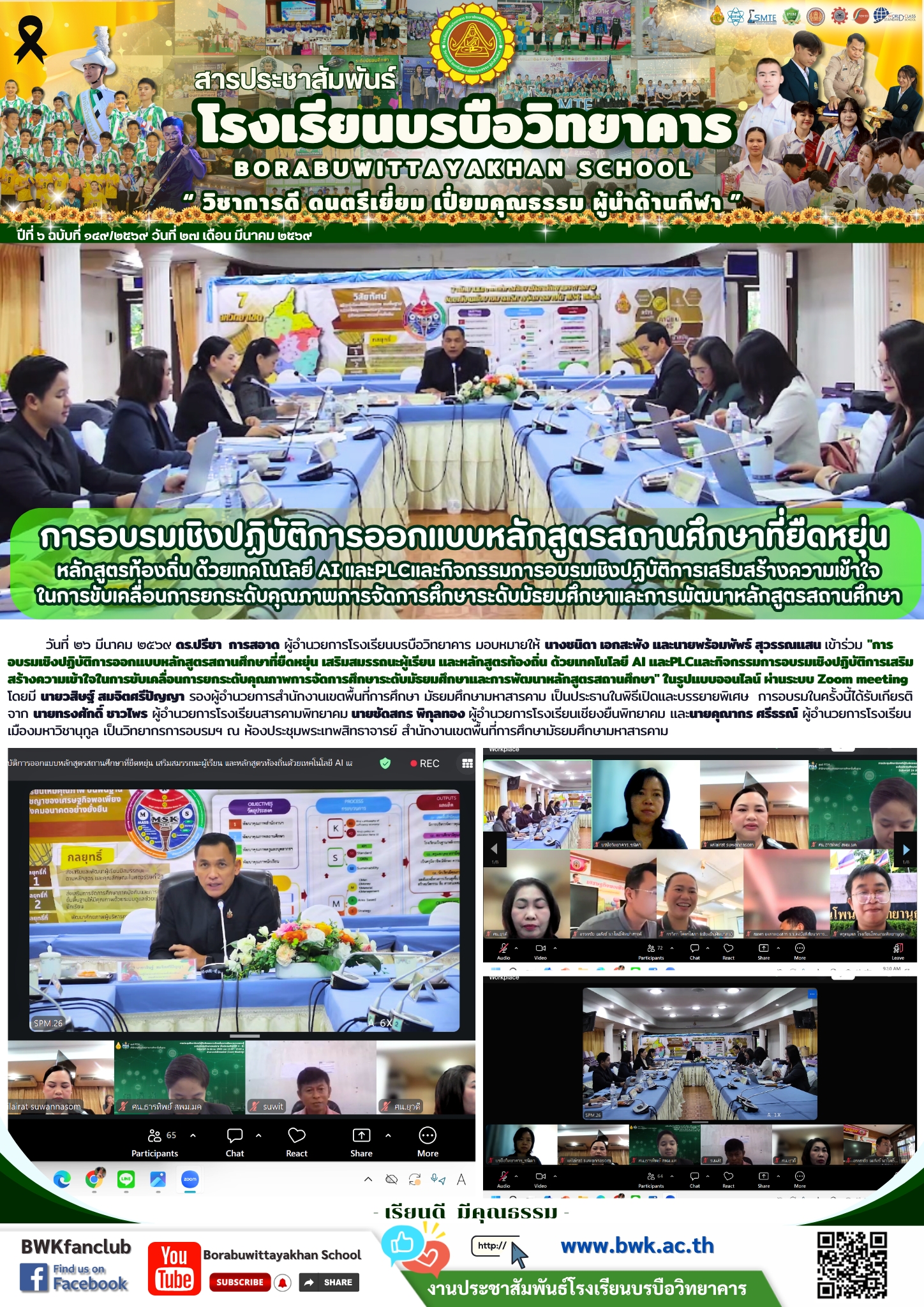 วันที่ ๒๖ มีนาคม ๒๕๖๙ ดร.ปรีชา การสอาด ผู้อำนวยการโรงเรียนบรบือวิทยาคาร มอบหมายให้ นางชนิดา เอกสะพัง และนายพร้อมพัพธ์ สุวรรณแสน เข้าร่วม "การอบรมเชิงปฏิบัติการออกแบบหลักสูตรสถานศึกษาที่ยืดหยุ่น เสริมสมรรถนะผู้เรียน และหลักสูตรท้องถิ่น ด้วยเทคโนโลยี AI และPLCและกิจกรรมการอบรมเชิงปฏิบัติการเสริมสร้างความเข้าใจในการขับเคลื่อนการยกระดับคุณภาพการจัดการศึกษาระดับมัธยมศึกษาและการพัฒนาหลักสูตรสถานศึกษา" ในรูปแบบออนไลน์ ผ่านระบบ Zoom meeting โดยมี นายวสิษฐ์ สมจิตศรีปัญญา รองผู้อำนวยการสำนักงานเขตพื้นที่การศึกษา มัธยมศึกษามหาสารคาม เป็นประธานในพิธีเปิดและบรรยายพิเศษ การอบรมในครั้งนี้ได้รับเกียรติจาก นายทรงศักดิ์ ชาวไพร ผู้อำนวยการโรงเรียนสารคามพิทยาคม นายชัดสกร พิกุลทอง ผู้อำนวยการโรงเรียนเชียงยืนพิทยาคม และนายคุณากร ศรีธรณ์ ผู้อำนวยการโรงเรียนเมืองมหาวิชานุกูล เป็นวิทยากรการอบรมฯ ณ ห้องประชุมพระเทพสิทธาจารย์ สำนักงานเขตพื้นที่การศึกษามัธยมศึกษามหาสารคาม