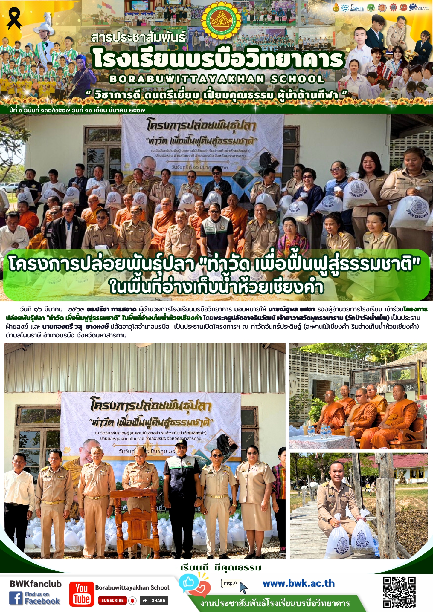 วันที่ ๑๖ มีนาคม ๒๕๖๙ ดร.ปรีชา การสอาด ผู้อำนวยการโรงเรียนบรบือวิทยาคาร มอบหมายให้ นายณัฐพล ยศดา รองผู้อำนวยการโรงเรียน เข้าร่วมโครงการปล่อยพันธุ์ปลา "ท่าวัด เพื่อฟื้นฟูสู่ธรรมชาติ" ในพื้นที่อ่างเก็บน้ำห้วยเชียงคำ โดยพระครูปลัดอาจริยวัฒน์ เจ้าอาวาสวัดพุทธวนาราม (วัดป่าวังน้ำเย็น) เป็นประธานฝ่ายสงฆ์ และ นายกองตรี วสุ ยางหงษ์ ปลัดอาวุโสอำเภอบรบือ เป็นประธานเปิดโครงการฯ ณ ท่าวัดจันทร์ประดิษฐ์ (สะพานไม้เชียงคำ ริมอ่างเก็บน้ำห้วยเชียงคำ) ตำบลโนนราษี อำเภอบรบือ จังหวัดมหาสารคาม