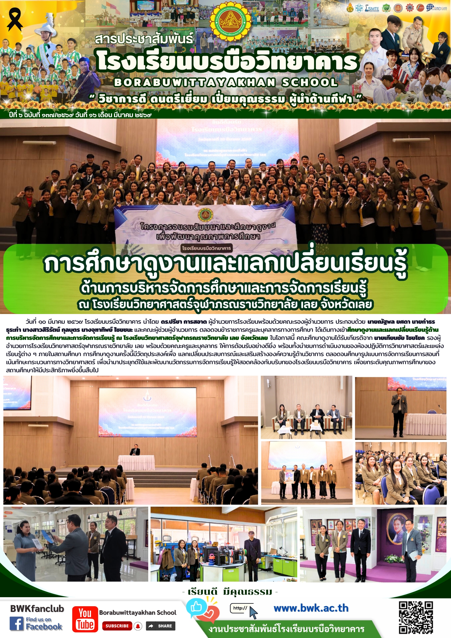 วันที่ ๑๐ มีนาคม ๒๕๖๙ โรงเรียนบรบือวิทยาคาร นำโดย ดร.ปรีชา การสอาด ผู้อำนวยการโรงเรียนพร้อมด้วยคณะรองผู้อำนวยการ ประกอบด้วย นายณัฐพล ยศดา นายกำธร ธุระทำ นางสาวสิริรัตน์ กุลบุตร นางจุฑาทิพย์ ไชยชนะ และคณะผู้ช่วยผู้อำนวยการ ตลอดจนข้าราชการครูและบุคลากรทางการศึกษา ได้เดินทางเข้าศึกษาดูงานและแลกเปลี่ยนเรียนรู้ด้านการบริหารจัดการศึกษาและการจัดการเรียนรู้ ณ โรงเรียนวิทยาศาสตร์จุฬาภรณราชวิทยาลัย เลย จังหวัดเลย ในโอกาสนี้ คณะศึกษาดูงานได้รับเกียรติจาก นายเทียนชัย ไชยโชค รองผู้อำนวยการโรงเรียนวิทยาศาสตร์จุฬาภรณราชวิทยาลัย เลย พร้อมด้วยคณะครูและบุคลากร ให้การต้อนรับอย่างดียิ่ง พร้อมทั้งนำชมการดำเนินงานของห้องปฏิบัติการวิทยาศาสตร์และแหล่งเรียนรู้ต่าง ๆ ภายในสถานศึกษา การศึกษาดูงานครั้งนี้มีวัตถุประสงค์เพื่อ แลกเปลี่ยนประสบการณ์และเสริมสร้างองค์ความรู้ด้านวิชาการ ตลอดจนศึกษารูปแบบการจัดการเรียนการสอนที่เน้นทักษะกระบวนการทางวิทยาศาสตร์ เพื่อนำมาประยุกต์ใช้และพัฒนานวัตกรรมการจัดการเรียนรู้ให้สอดคล้องกับบริบทของโรงเรียนบรบือวิทยาคาร เพื่อยกระดับคุณภาพการศึกษาของสถานศึกษาให้มีประสิทธิภาพยิ่งขึ้นสืบไป