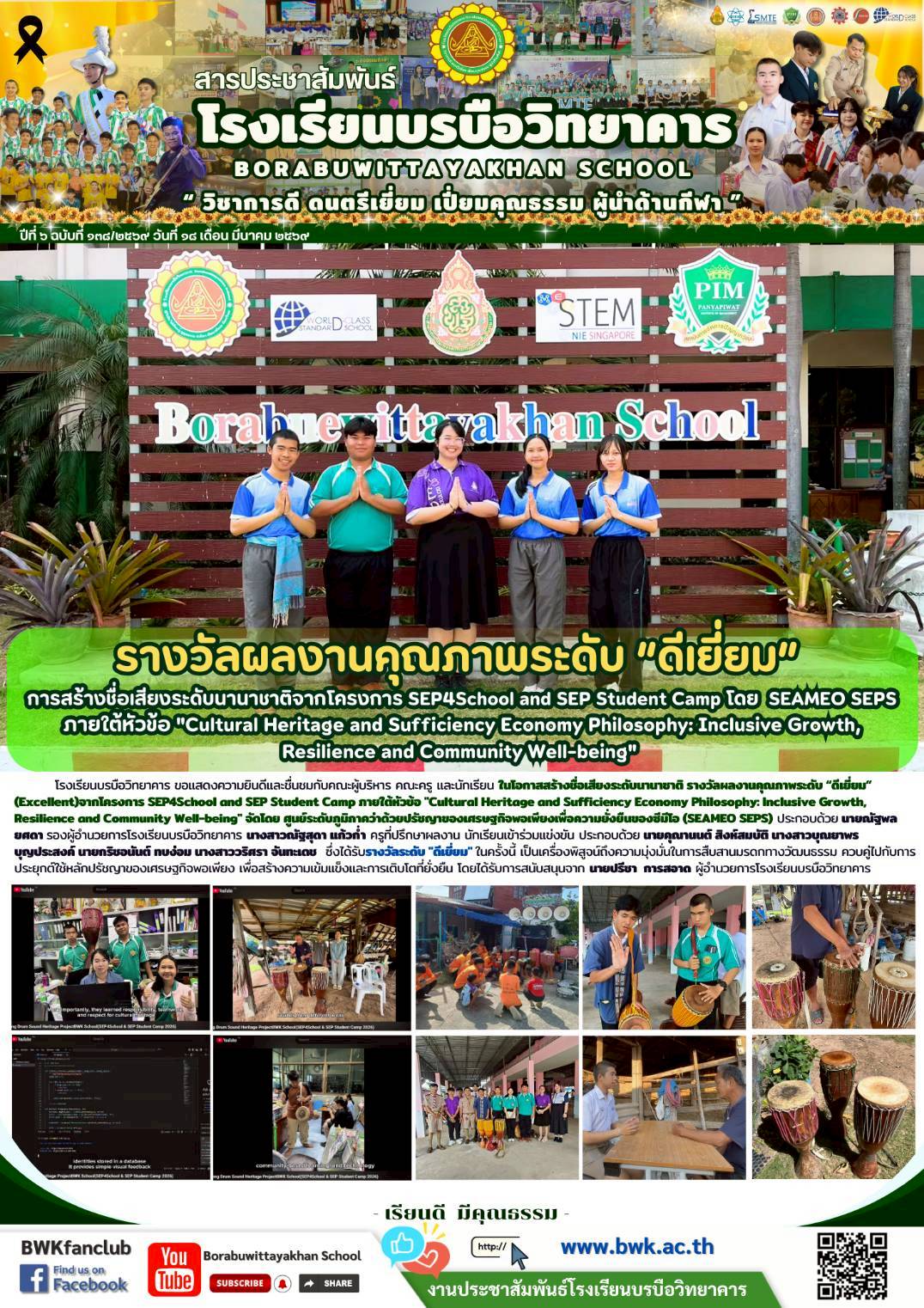 โรงเรียนบรบือวิทยาคาร ขอแสดงความยินดีและชื่นชมกับคณะผู้บริหาร คณะครู และนักเรียน ในโอกาสสร้างชื่อเสียงระดับนานาชาติ รางวัลผลงานคุณภาพระดับ “ดีเยี่ยม” (Excellent)จากโครงการ SEP4School and SEP Student Camp ภายใต้หัวข้อ "Cultural Heritage and Sufficiency Economy Philosophy: Inclusive Growth, Resilience and Community Well-being" จัดโดย ศูนย์ระดับภูมิภาคว่าด้วยปรัชญาของเศรษฐกิจพอเพียงเพื่อความยั่งยืนของซีมีโอ (SEAMEO SEPS) ประกอบด้วย นายณัฐพล ยศดา รองผู้อำนวยการโรงเรียนบรบือวิทยาคาร นางสาวณัฐสุดา แก้วก่ำ ครูที่ปรึกษาผลงาน นักเรียนเข้าร่วมแข่งขัน ประกอบด้วย นายคุณานนต์ สิงห์สมบัติ นางสาวบุณยาพร บุญประสงค์ นายกริชอนันต์ ทบง่อม นางสาววริศรา จันทะเดช ซึ่งได้รับรางวัลระดับ "ดีเยี่ยม" ในครั้งนี้ เป็นเครื่องพิสูจน์ถึงความมุ่งมั่นในการสืบสานมรดกทางวัฒนธรรม ควบคู่ไปกับการประยุกต์ใช้หลักปรัชญาของเศรษฐกิจพอเพียง เพื่อสร้างความเข้มแข็งและการเติบโตที่ยั่งยืน โดยได้รับการสนับสนุนจาก นายปรีชา การสอาด ผู้อำนวยการโรงเรียนบรบือวิทยาคาร