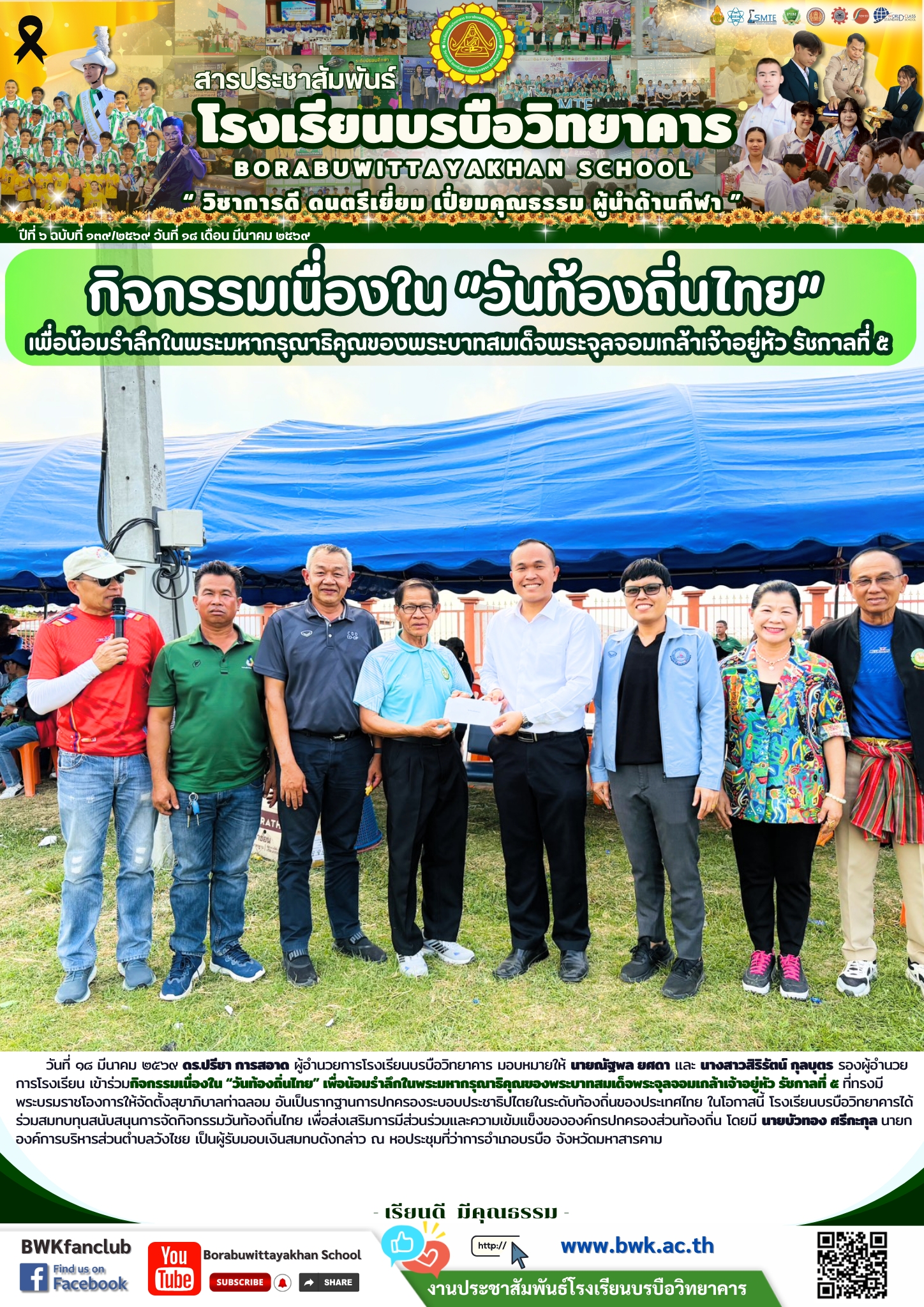 วันที่ ๑๘ มีนาคม ๒๕๖๙ ดร.ปรีชา การสอาด ผู้อำนวยการโรงเรียนบรบือวิทยาคาร มอบหมายให้ นายณัฐพล ยศดา และ นางสาวสิริรัตน์ กุลบุตร รองผู้อำนวยการโรงเรียน เข้าร่วมกิจกรรมเนื่องใน “วันท้องถิ่นไทย” เพื่อน้อมรำลึกในพระมหากรุณาธิคุณของพระบาทสมเด็จพระจุลจอมเกล้าเจ้าอยู่หัว รัชกาลที่ ๕ ที่ทรงมีพระบรมราชโองการให้จัดตั้งสุขาภิบาลท่าฉลอม อันเป็นรากฐานการปกครองระบอบประชาธิปไตยในระดับท้องถิ่นของประเทศไทย ในโอกาสนี้ โรงเรียนบรบือวิทยาคารได้ร่วมสมทบทุนสนับสนุนการจัดกิจกรรมวันท้องถิ่นไทย เพื่อส่งเสริมการมีส่วนร่วมและความเข้มแข็งขององค์กรปกครองส่วนท้องถิ่น โดยมี นายบัวทอง ศรีกะกุล นายกองค์การบริหารส่วนตำบลวังไชย เป็นผู้รับมอบเงินสมทบดังกล่าว ณ หอประชุมที่ว่าการอำเภอบรบือ จังหวัดมหาสารคาม