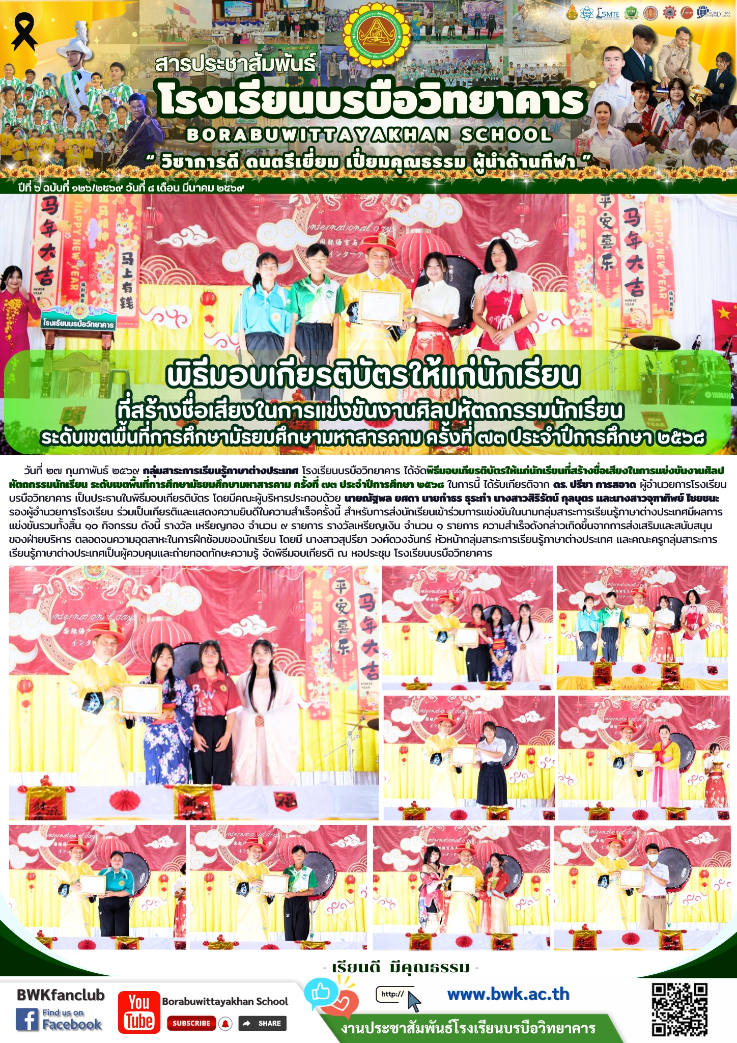 วันที่ ๒๗ กุมภาพันธ์ ๒๕๖๙ กลุ่มสาระการเรียนรู้ภาษาต่างประเทศ โรงเรียนบรบือวิทยาคาร ได้จัดพิธีมอบเกียรติบัตรให้แก่นักเรียนที่สร้างชื่อเสียงในการแข่งขันงานศิลปหัตถกรรมนักเรียน ระดับเขตพื้นที่การศึกษามัธยมศึกษามหาสารคาม ครั้งที่ ๗๓ ประจำปีการศึกษา ๒๕๖๘ ในการนี้ ได้รับเกียรติจาก ดร. ปรีชา การสอาด ผู้อำนวยการโรงเรียนบรบือวิทยาคาร เป็นประธานในพิธีมอบเกียรติบัตร โดยมีคณะผู้บริหารประกอบด้วย นายณัฐพล ยศดา นายกำธร ธุระทำ นางสาวสิริรัตน์ กุลบุตร และนางสาวจุฑาทิพย์ ไชยชนะ รองผู้อำนวยการโรงเรียน ร่วมเป็นเกียรติและแสดงความยินดีในความสำเร็จครั้งนี้ สำหรับการส่งนักเรียนเข้าร่วมการแข่งขันในนามกลุ่มสาระการเรียนรู้ภาษาต่างประเทศมีผลการแข่งขันรวมทั้งสิ้น ๑๐ กิจกรรม ดังนี้ รางวัล เหรียญทอง จำนวน ๙ รายการ รางวัลเหรียญเงิน จำนวน ๑ รายการ ความสำเร็จดังกล่าวเกิดขึ้นจากการส่งเสริมและสนับสนุนของฝ่ายบริหาร ตลอดจนความอุตสาหะในการฝึกซ้อมของนักเรียน โดยมี นางสาวสุปรียา วงศ์ดวงจันทร์ หัวหน้ากลุ่มสาระการเรียนรู้ภาษาต่างประเทศ และคณะครูกลุ่มสาระการเรียนรู้ภาษาต่างประเทศเป็นผู้ควบคุมและถ่ายทอดทักษะความรู้ จัดพิธีมอบเกียรติ ณ หอประชุม โรงเรียนบรบือวิทยาคาร