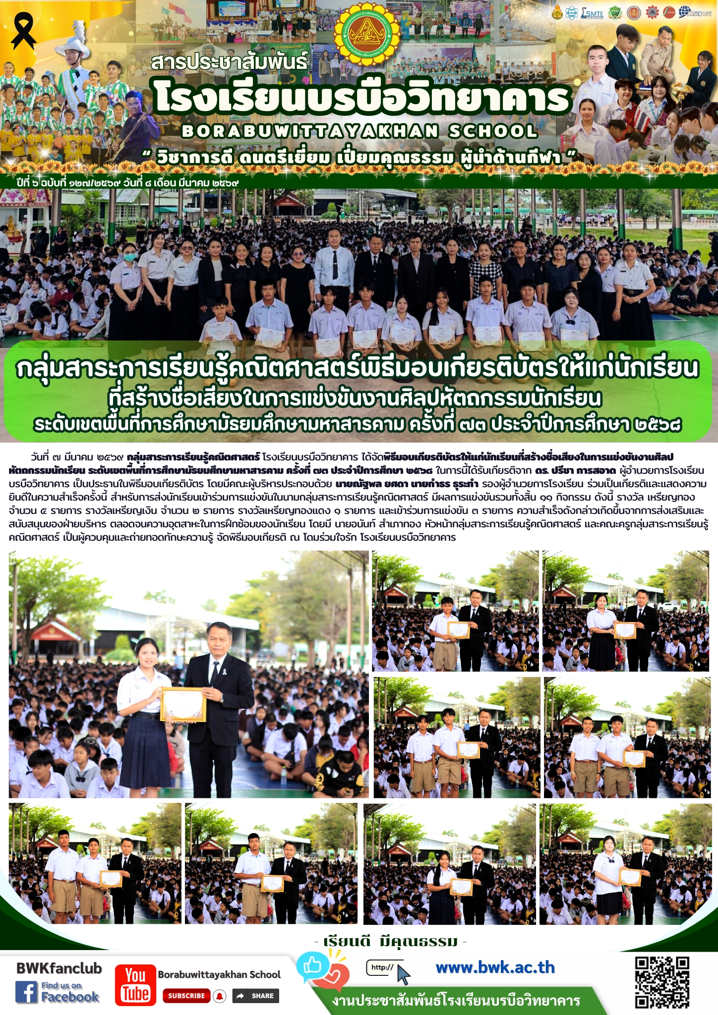 วันที่ ๗ มีนาคม ๒๕๖๙ กลุ่มสาระการเรียนรู้คณิตศาสตร์ โรงเรียนบรบือวิทยาคาร ได้จัดพิธีมอบเกียรติบัตรให้แก่นักเรียนที่สร้างชื่อเสียงในการแข่งขันงานศิลปหัตถกรรมนักเรียน ระดับเขตพื้นที่การศึกษามัธยมศึกษามหาสารคาม ครั้งที่ ๗๓ ประจำปีการศึกษา ๒๕๖๘ ในการนี้ได้รับเกียรติจาก ดร. ปรีชา การสอาด ผู้อำนวยการโรงเรียนบรบือวิทยาคาร เป็นประธานในพิธีมอบเกียรติบัตร โดยมีคณะผู้บริหารประกอบด้วย นายณัฐพล ยศดา นายกำธร ธุระทำ รองผู้อำนวยการโรงเรียน ร่วมเป็นเกียรติและแสดงความยินดีในความสำเร็จครั้งนี้ สำหรับการส่งนักเรียนเข้าร่วมการแข่งขันในนามกลุ่มสาระการเรียนรู้คณิตศาสตร์ มีผลการแข่งขันรวมทั้งสิ้น ๑๑ กิจกรรม ดังนี้ รางวัล เหรียญทอง จำนวน ๕ รายการ รางวัลเหรียญเงิน จำนวน ๒ รายการ รางวัลเหรียญทองแดง ๑ รายการ และเข้าร่วมการแข่งขัน ๓ รายการ ความสำเร็จดังกล่าวเกิดขึ้นจากการส่งเสริมและสนับสนุนของฝ่ายบริหาร ตลอดจนความอุตสาหะในการฝึกซ้อมของนักเรียน โดยมี นายอนันท์ สำเภาทอง หัวหน้ากลุ่มสาระการเรียนรู้คณิตศาสตร์ และคณะครูกลุ่มสาระการเรียนรู้คณิตศาสตร์ เป็นผู้ควบคุมและถ่ายทอดทักษะความรู้ จัดพิธีมอบเกียรติ ณ โดมร่วมใจรัก โรงเรียนบรบือวิทยาคาร