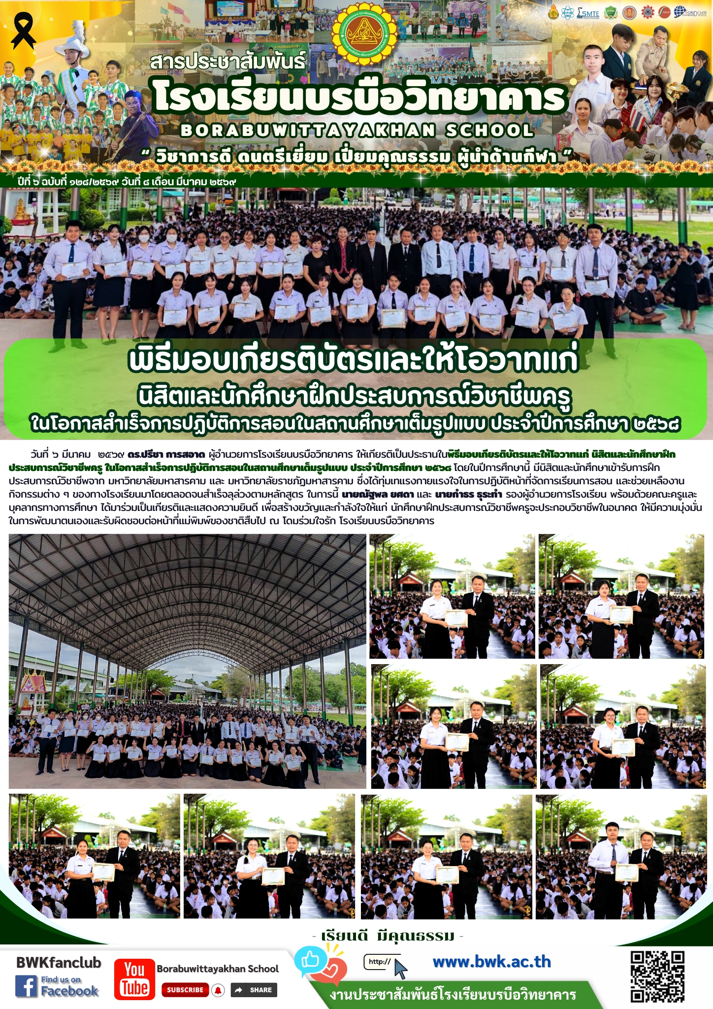 วันที่ ๖ มีนาคม ๒๕๖๙ ดร.ปรีชา การสอาด ผู้อำนวยการโรงเรียนบรบือวิทยาคาร ให้เกียรติเป็นประธานในพิธีมอบเกียรติบัตรและให้โอวาทแก่ นิสิตและนักศึกษาฝึกประสบการณ์วิชาชีพครู ในโอกาสสำเร็จการปฏิบัติการสอนในสถานศึกษาเต็มรูปแบบ ประจำปีการศึกษา ๒๕๖๘ โดยในปีการศึกษานี้ มีนิสิตและนักศึกษาเข้ารับการฝึกประสบการณ์วิชาชีพจาก มหาวิทยาลัยมหาสารคาม และ มหาวิทยาลัยราชภัฏมหาสารคาม ซึ่งได้ทุ่มเทแรงกายแรงใจในการปฏิบัติหน้าที่จัดการเรียนการสอน และช่วยเหลืองานกิจกรรมต่าง ๆ ของทางโรงเรียนมาโดยตลอดจนสำเร็จลุล่วงตามหลักสูตร ในการนี้ นายณัฐพล ยศดา และ นายกำธร ธุระทำ รองผู้อำนวยการโรงเรียน พร้อมด้วยคณะครูและบุคลากรทางการศึกษา ได้มาร่วมเป็นเกียรติและแสดงความยินดี เพื่อสร้างขวัญและกำลังใจให้แก่ นักศึกษาฝึกประสบการณ์วิชาชีพครูจะประกอบวิชาชีพในอนาคต ให้มีความมุ่งมั่นในการพัฒนาตนเองและรับผิดชอบต่อหน้าที่แม่พิมพ์ของชาติสืบไป ณ โดมร่วมใจรัก โรงเรียนบรบือวิทยาคาร