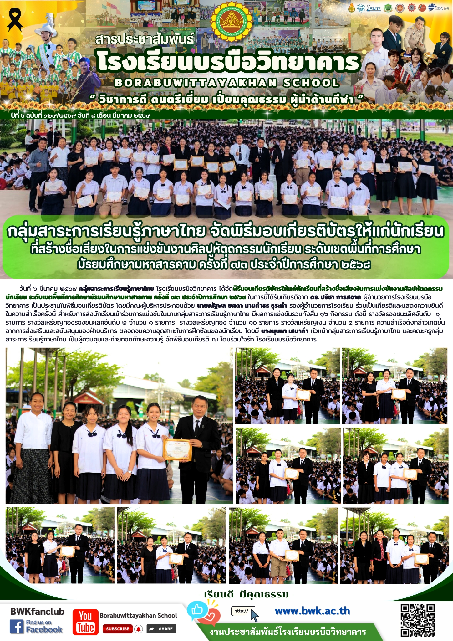 วันที่ ๖ มีนาคม ๒๕๖๙ กลุ่มสาระการเรียนรู้ภาษาไทย โรงเรียนบรบือวิทยาคาร ได้จัดพิธีมอบเกียรติบัตรให้แก่นักเรียนที่สร้างชื่อเสียงในการแข่งขันงานศิลปหัตถกรรมนักเรียน ระดับเขตพื้นที่การศึกษามัธยมศึกษามหาสารคาม ครั้งที่ ๗๓ ประจำปีการศึกษา ๒๕๖๘ ในการนี้ได้รับเกียรติจาก ดร. ปรีชา การสอาด ผู้อำนวยการโรงเรียนบรบือวิทยาคาร เป็นประธานในพิธีมอบเกียรติบัตร โดยมีคณะผู้บริหารประกอบด้วย นายณัฐพล ยศดา นายกำธร ธุระทำ รองผู้อำนวยการโรงเรียน ร่วมเป็นเกียรติและแสดงความยินดีในความสำเร็จครั้งนี้ สำหรับการส่งนักเรียนเข้าร่วมการแข่งขันในนามกลุ่มสาระการเรียนรู้ภาษาไทย มีผลการแข่งขันรวมทั้งสิ้น ๑๖ กิจกรรม ดังนี้ รางวัลรองชนะเลิศอันดับ ๑ รายการ รางวัลเหรียญทองรองชนะเลิศอันดับ ๒ จำนวน ๑ รายการ รางวัลเหรียญทอง จำนวน ๑๐ รายการ รางวัลเหรียญเงิน จำนวน ๔ รายการ ความสำเร็จดังกล่าวเกิดขึ้นจากการส่งเสริมและสนับสนุนของฝ่ายบริหาร ตลอดจนความอุตสาหะในการฝึกซ้อมของนักเรียน โดยมี นางบุบผา เสนาคำ หัวหน้ากลุ่มสาระการเรียนรู้ภาษาไทย และคณะครูกลุ่มสาระการเรียนรู้ภาษาไทย เป็นผู้ควบคุมและถ่ายทอดทักษะความรู้ จัดพิธีมอบเกียรติ ณ โดมร่วมใจรัก โรงเรียนบรบือวิทยาคาร