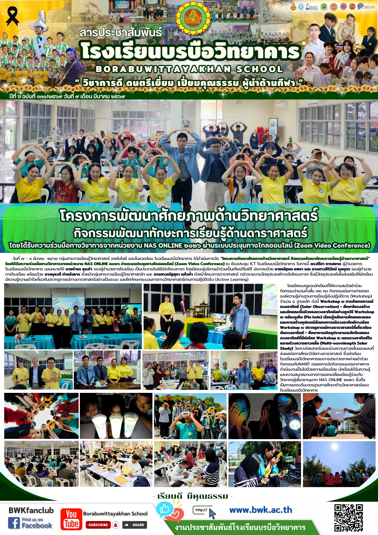 วันที่ ๗ - ๘ มีนาคม ๒๕๖๙ กลุ่มสาระการเรียนรู้วิทยาศาสตร์ เทคโนโลยี และสิ่งแวดล้อม โรงเรียนบรบือวิทยาคาร ได้ดำเนินการจัด “โครงการพัฒนาศักยภาพด้านวิทยาศาสตร์ กิจกรรมพัฒนาทักษะการเรียนรู้ด้านดาราศาสตร์” โดยได้รับความร่วมมือทางวิชาการจากหน่วยงาน NAS ONLINE ๒๐๒๖ ผ่านระบบประชุมทางไกลออนไลน์ (Zoom Video Conference) ณ ห้องประชุม ICT โรงเรียนบรบือวิทยาคาร ในการนี้ ดร.ปรีชา การสอาด ผู้อำนวยการโรงเรียนบรบือวิทยาคาร มอบหมายให้ นายกำธร ธุระทำ รองผู้อำนวยการโรงเรียน เป็นประธานในพิธีเปิดโครงการฯ โดยมีคณะผู้บริหารเข้าร่วมเป็นเกียรติในพิธี ประกอบด้วย นายณัฐพล ยศดา และ นางสาวสิริรัตน์ กุลบุตร รองผู้อำนวยการโรงเรียน พร้อมด้วย นางกุลวดี ผ่านจังหาร หัวหน้ากลุ่มสาระการเรียนรู้วิทยาศาสตร์ฯ และ นางสาวณัฐสุดา แก้วก่ำ หัวหน้าโครงการดาราศาสตร์ กล่าวรายงานวัตถุประสงค์การจัดโครงการฯ ซึ่งมีวัตถุประสงค์เพื่อส่งเสริมให้นักเรียนมีความรู้ความเข้าใจเกี่ยวกับปรากฏการณ์ทางดาราศาสตร์อย่างเป็นระบบ และฝึกทักษะกระบวนการทางวิทยาศาสตร์ผ่านการปฏิบัติจริง (Active Learning) โดยมีคณะครูและนักเรียนที่ให้ความสนใจเข้าร่วมกิจกรรมจำนวนทั้งสิ้น ๗๐ คน กิจกรรมเน้นการถ่ายทอดองค์ความรู้ผ่านฐานการเรียนรู้เชิงปฏิบัติการ (Workshop) จำนวน ๔ ฐานหลัก ดังนี้ Workshop ๑: การสังเกตการณ์ดวงอาทิตย์ (Solar Observation) – ศึกษาโครงสร้างและลักษณะพื้นผิวของดวงอาทิตย์อย่างถูกวิธี Workshop ๒: กล้องรูเข็ม (Pin hole) เรียนรู้หลักการหักเหของแสงและการสร้างอุปกรณ์สังเกตการณ์ดวงอาทิตย์ทางอ้อม Workshop ๓: ปรากฏการณ์ทางดาราศาสตร์ที่เกี่ยวข้องกับดวงอาทิตย์ – ศึกษาการเกิดอุปราคาและอิทธิพลของดวงอาทิตย์ที่มีต่อโลก Workshop ๔: แสงดวงอาทิตย์ในหลายช่วงความยาวคลื่น (Multi-wavelength Solar Study) วิเคราะห์สเปกตรัมและช่วงความยาวคลื่นของแสงที่ส่งผลต่อการศึกษาวิจัยทางดาราศาสตร์ ซึ่งนักเรียนโรงเรียนบรบือวิทยาคารชนะการประกวดภาพถ่ายเข้าร่วมกิจกรรมกับNARIT ตลอดการจัดกิจกรรมบรรยากาศการดำเนินงานเป็นไปด้วยความเรียบร้อย นักเรียนได้รับความรู้และความสนุกสนานจากการแลกเปลี่ยนเรียนรู้ร่วมกับวิทยากรผู้เชี่ยวชาญจาก NAS ONLINE ๒๐๒๖ ซึ่งถือเป็นการยกระดับมาตรฐานการศึกษาด้านวิทยาศาสตร์ของโรงเรียนบรบือวิทยาคาร
