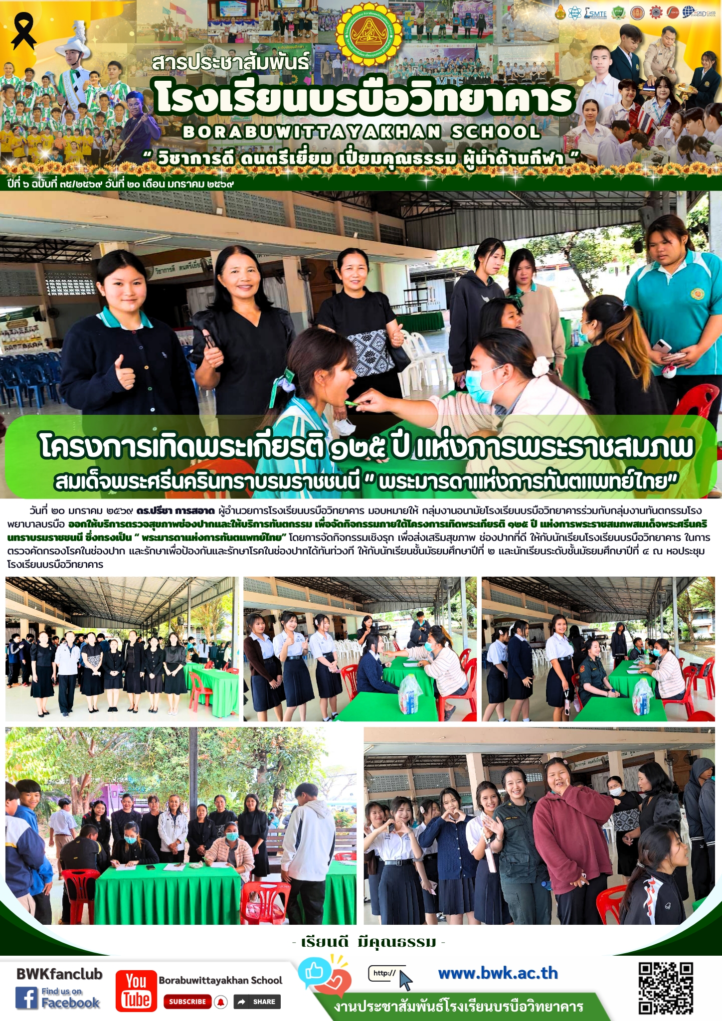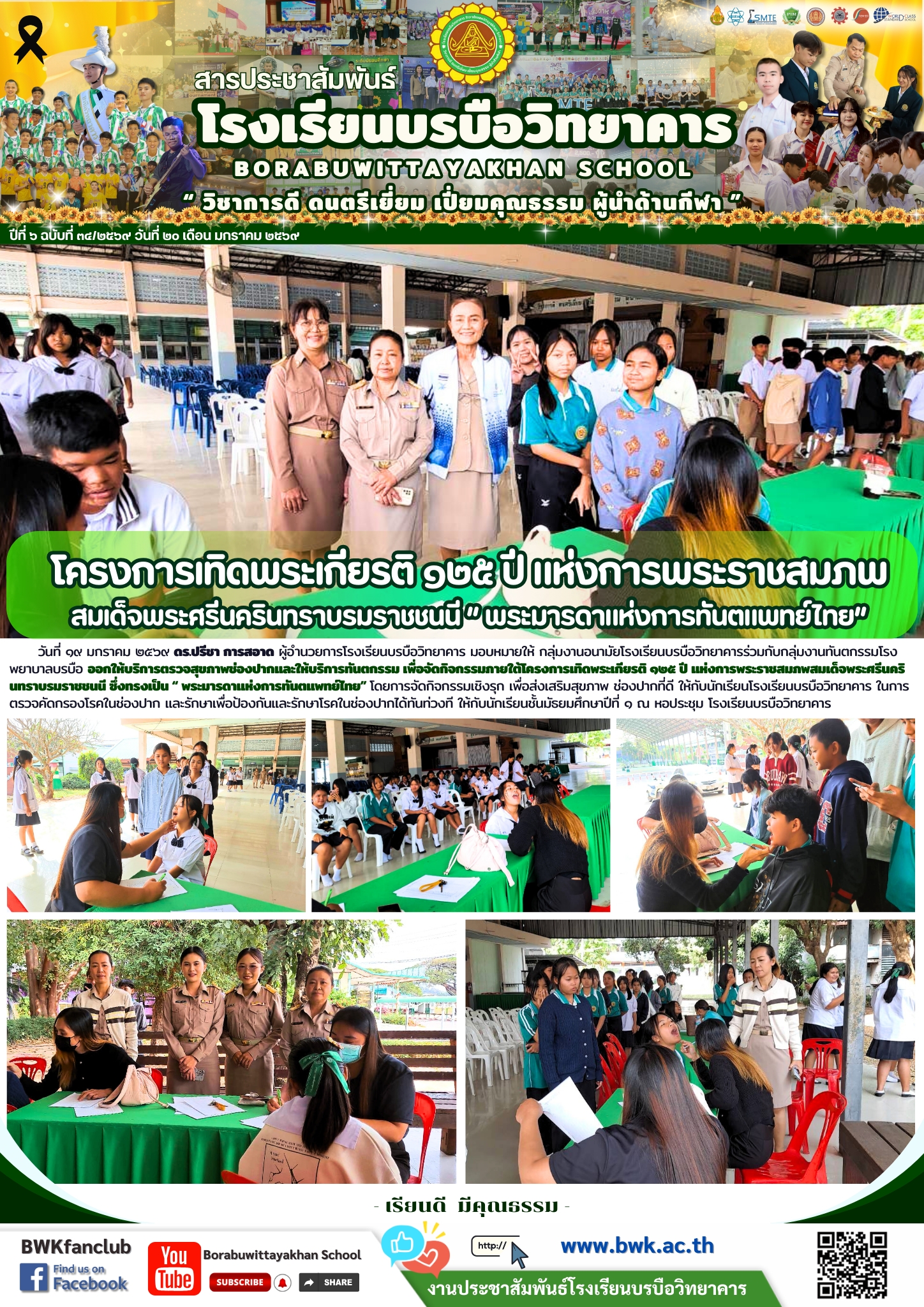วันที่ ๑๙ มกราคม ๒๕๖๙ ดร.ปรีชา การสอาด ผู้อำนวยการโรงเรียนบรบือวิทยาคาร มอบหมายให้ กลุ่มงานอนามัยโรงเรียนบรบือวิทยาคารร่วมกับกลุ่มงานทันตกรรมโรงพยาบาลบรบือ ออกให้บริการตรวจสุขภาพช่องปากและให้บริการทันตกรรม เพื่อจัดกิจกรรมภายใต้โครงการเทิดพระเกียรติ ๑๒๕ ปี แห่งการพระราชสมภพสมเด็จพระศรีนครินทราบรมราชชนนี ซึ่งทรงเป็น “ พระมารดาแห่งการทันตแพทย์ไทย” โดยการจัดกิจกรรมเชิงรุก เพื่อส่งเสริมสุขภาพ ช่องปากที่ดี ให้กับนักเรียนโรงเรียนบรบือวิทยาคาร ในการตรวจคัดกรองโรคในช่องปาก และรักษาเพื่อป้องกันและรักษาโรคในช่องปากได้ทันท่วงที ให้กับนักเรียนชั้นมัธยมศึกษาปีที่ ๑ ณ หอประชุม โรงเรียนบรบือวิทยาคาร