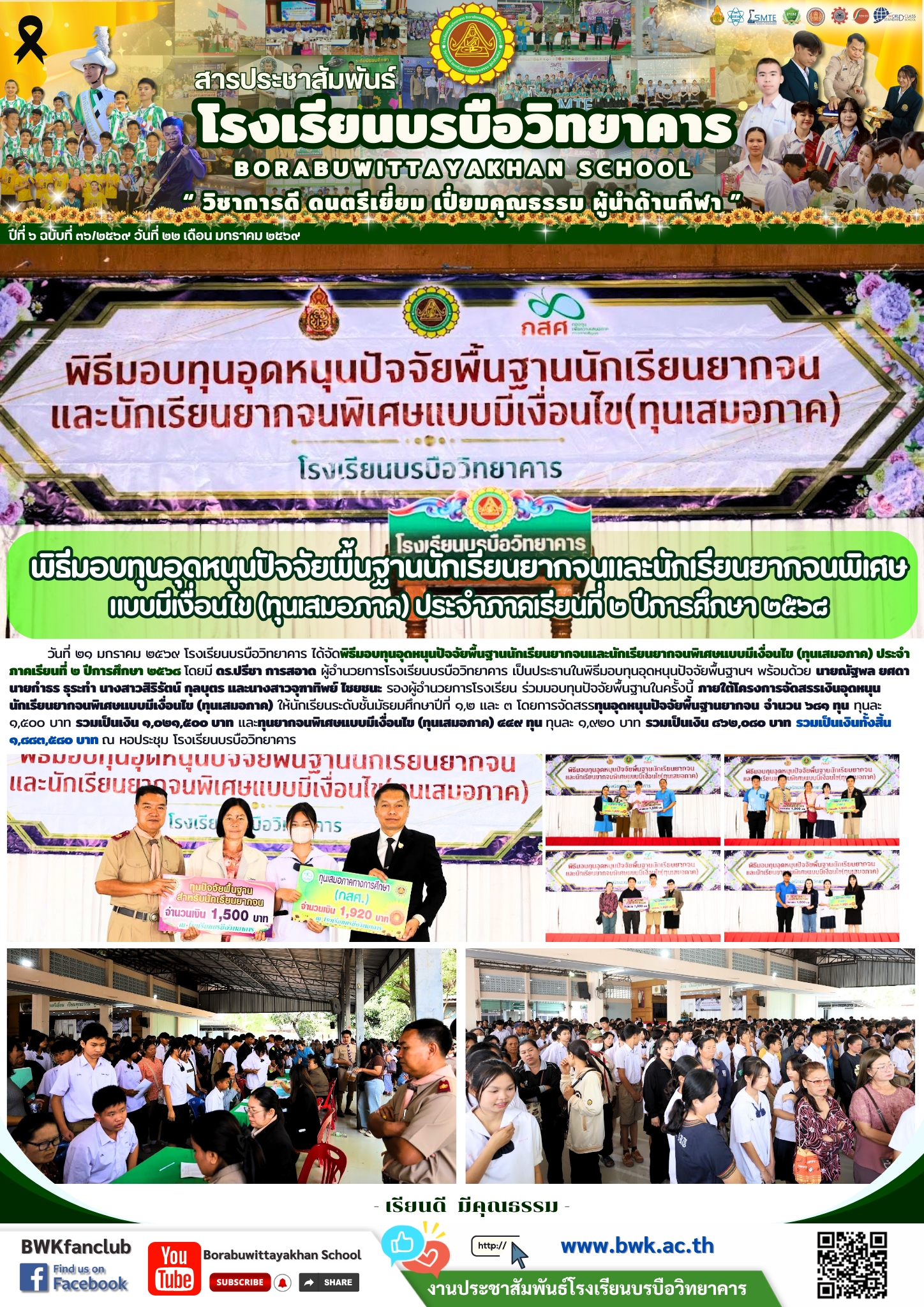วันที่ ๒๑ มกราคม ๒๕๖๙ โรงเรียนบรบือวิทยาคาร ได้จัดพิธีมอบทุนอุดหนุนปัจจัยพื้นฐานนักเรียนยากจนและนักเรียนยากจนพิเศษแบบมีเงื่อนไข (ทุนเสมอภาค) ประจำภาคเรียนที่ ๒ ปีการศึกษา ๒๕๖๘ โดยมี ดร.ปรีชา การสอาด ผู้อำนวยการโรงเรียนบรบือวิทยาคาร เป็นประธานในพิธีมอบทุนอุดหนุนปัจจัยพื้นฐานฯ พร้อมด้วย นายณัฐพล ยศดา นายกำธร ธุระทำ นางสาวสิริรัตน์ กุลบุตร และนางสาวจุฑาทิพย์ ไชยชนะ รองผู้อำนวยการโรงเรียน ร่วมมอบทุนปัจจัยพื้นฐานในครั้งนี้ ภายใต้โครงการจัดสรรเงินอุดหนุนนักเรียนยากจนพิเศษแบบมีเงื่อนไข (ทุนเสมอภาค) ให้นักเรียนระดับชั้นมัธยมศึกษาปีที่ ๑,๒ และ ๓ โดยการจัดสรรทุนอุดหนุนปัจจัยพื้นฐานยากจน จำนวน ๖๘๑ ทุน ทุนละ ๑,๕๐๐ บาท รวมเป็นเงิน ๑,๐๒๑,๕๐๐ บาท และทุนยากจนพิเศษแบบมีเงื่อนไข (ทุนเสมอภาค) ๔๔๙ ทุน ทุนละ ๑,๙๒๐ บาท รวมเป็นเงิน ๘๖๒,๐๘๐ บาท รวมเป็นเงินทั้งสิ้น ๑,๘๘๓,๕๘๐ บาท ณ หอประชุม โรงเรียนบรบือวิทยาคาร