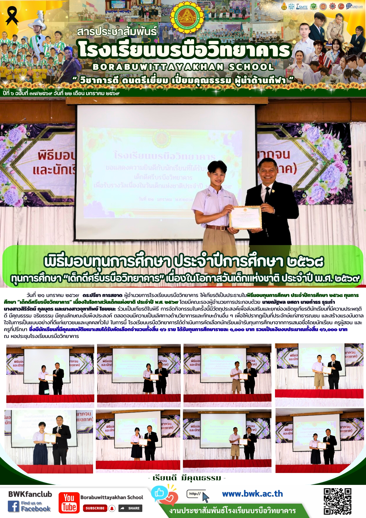 วันที่ ๒๑ มกราคม ๒๕๖๙ ดร.ปรีชา การสอาด ผู้อำนวยการโรงเรียนบรบือวิทยาคาร ให้เกียรติเป็นประธานในพิธีมอบทุนการศึกษา ประจำปีการศึกษา ๒๕๖๘ ทุนการศึกษา “เด็กดีศรีบรบือวิทยาคาร” เนื่องในโอกาสวันเด็กแห่งชาติ ประจำปี พ.ศ. ๒๕๖๙ โดยมีคณะรองผู้อำนวยการประกอบด้วย นายณัฐพล ยศดา นายกำธร ธุระทำ นางสาวสิริรัตน์ กุลบุตร และนางสาวจุฑาทิพย์ ไชยชนะ ร่วมเป็นเกียรติในพิธี การจัดกิจกรรมในครั้งนี้มีวัตถุประสงค์เพื่อส่งเสริมและยกย่องเชิดชูเกียรตินักเรียนที่มีความประพฤติดี มีคุณธรรม จริยธรรม มีคุณลักษณะอันพึงประสงค์ ตลอดจนมีความเป็นเลิศทางด้านวิชาการและทักษะด้านอื่น ๆ เพื่อให้ปรากฏเป็นที่ประจักษ์แก่สาธารณชน และสร้างแรงบันดาลใจในการเป็นแบบอย่างที่ดีแก่เยาวชนและบุคคลทั่วไป ในการนี้ โรงเรียนบรบือวิทยาคารได้ดำเนินการคัดเลือกนักเรียนเข้ารับทุนการศึกษาจากการเสนอชื่อโดยนักเรียน ครูผู้สอน และครูที่ปรึกษา ซึ่งมีนักเรียนที่มีคุณสมบัติเหมาะสมได้รับคัดเลือกจำนวนทั้งสิ้น ๑๖ ราย ได้รับทุนการศึกษารายละ ๑,๐๐๐ บาท รวมเป็นเงินงบประมาณทั้งสิ้น ๑๖,๐๐๐ บาท ณ หอประชุมโรงเรียนบรบือวิทยาคาร
